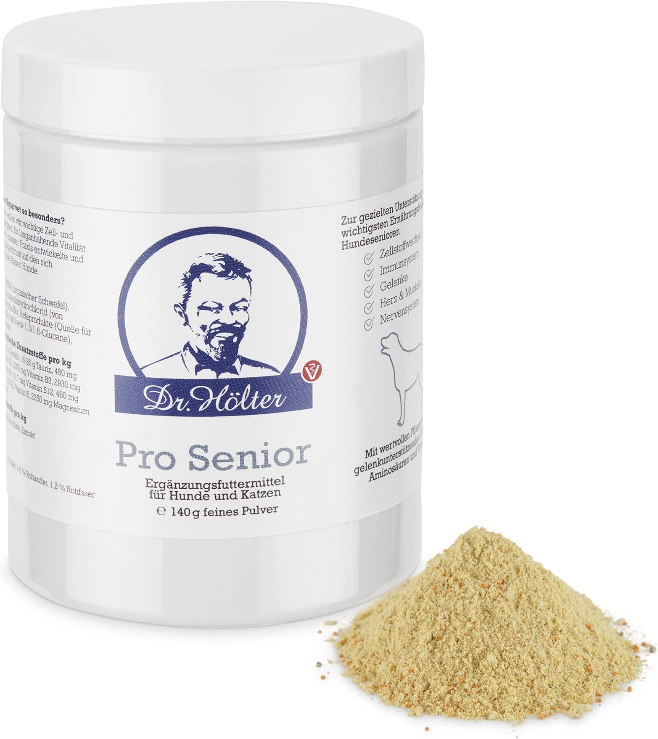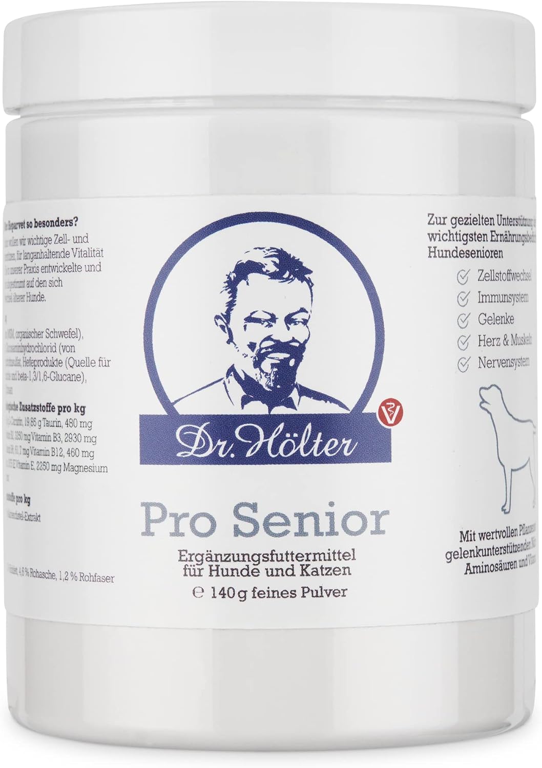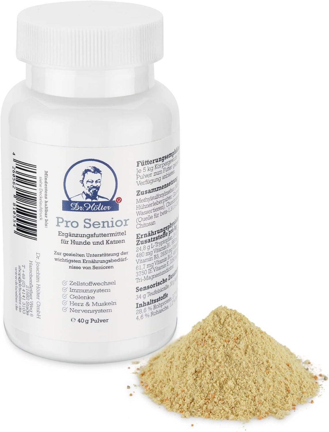 Zutaten Pro Senior: Zutat: Methylsulfonylmethan (MSM, organischer Schwefel), Hefenerzeugnis (Saccharomyces cerevisiae, hydrolysiert), Heidelbeere (getrocknet), Glucosaminhydrochlorid (von Wassertieren), Chondroitinsulfat (vom Rind), Granatapfelschalen, Hefenerzeugnis (inaktiviertes Fermentat von Saccharomyces cerevisiae und Cyberlindnera jadinii 4,8%), Tri-Magnesiumdicitrat, Cantaloupe-Melonen-Konzentrat (0,4%), Chitosan. Wenn Kapseln: Kapselhülle aus Hydroxypropylmethylcellulose. Zusatzstoff: Anteil pro kg Originalsubstanz Rohprotein 21,9 % Rohfett 2,1 % Rohasche 5,0 % Rohfaser 1,2 % Phosphor 0,3 % Natrium 0,65 %. Ernährungsphysiologische Zusatzstoffe Zusatzstoff: Anteil pro kg Originalsubstanz:: L-Tryptophan 27,8 g L-Carnitin 26 g Taurin 15,9 g Thiamin (Vitamin B1) 384 mg Riboflavin (Vitamin B2) 788 mg Niacinamid (Vitamin B3) 1400 mg Calciumpantothenat (Vitamin B5) 2350 mg Pyridoxin (Vitamin B6) 240 mg Cobalamin (Vitamin B12) 49 mg Folsäure 368 mg Biotin 239 mg Vitamin E (alpha-Tocopherolacetat) 3090 mg Sensorische Zusatzstoffe: Mariendistel-Extrakt 16 g