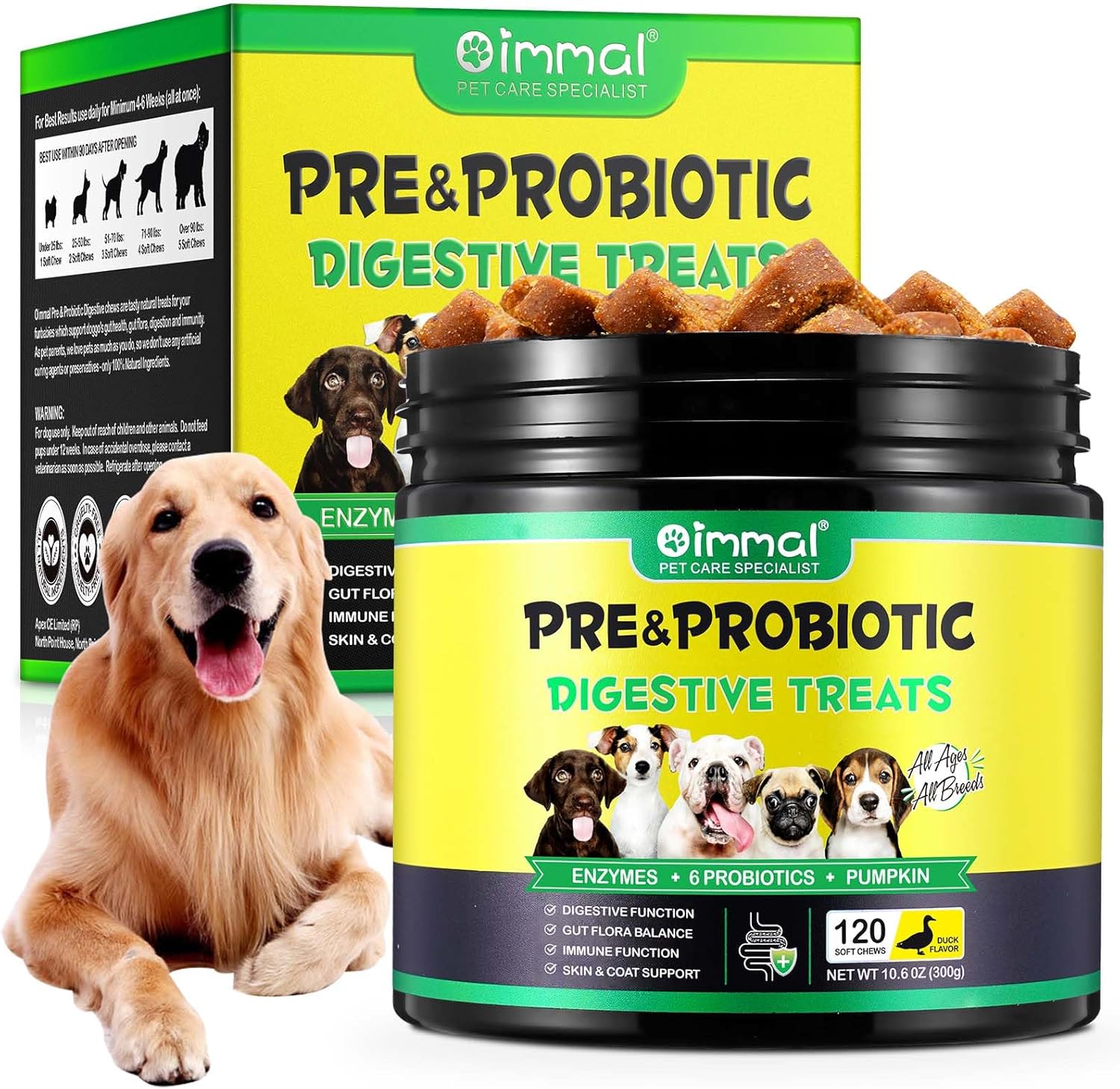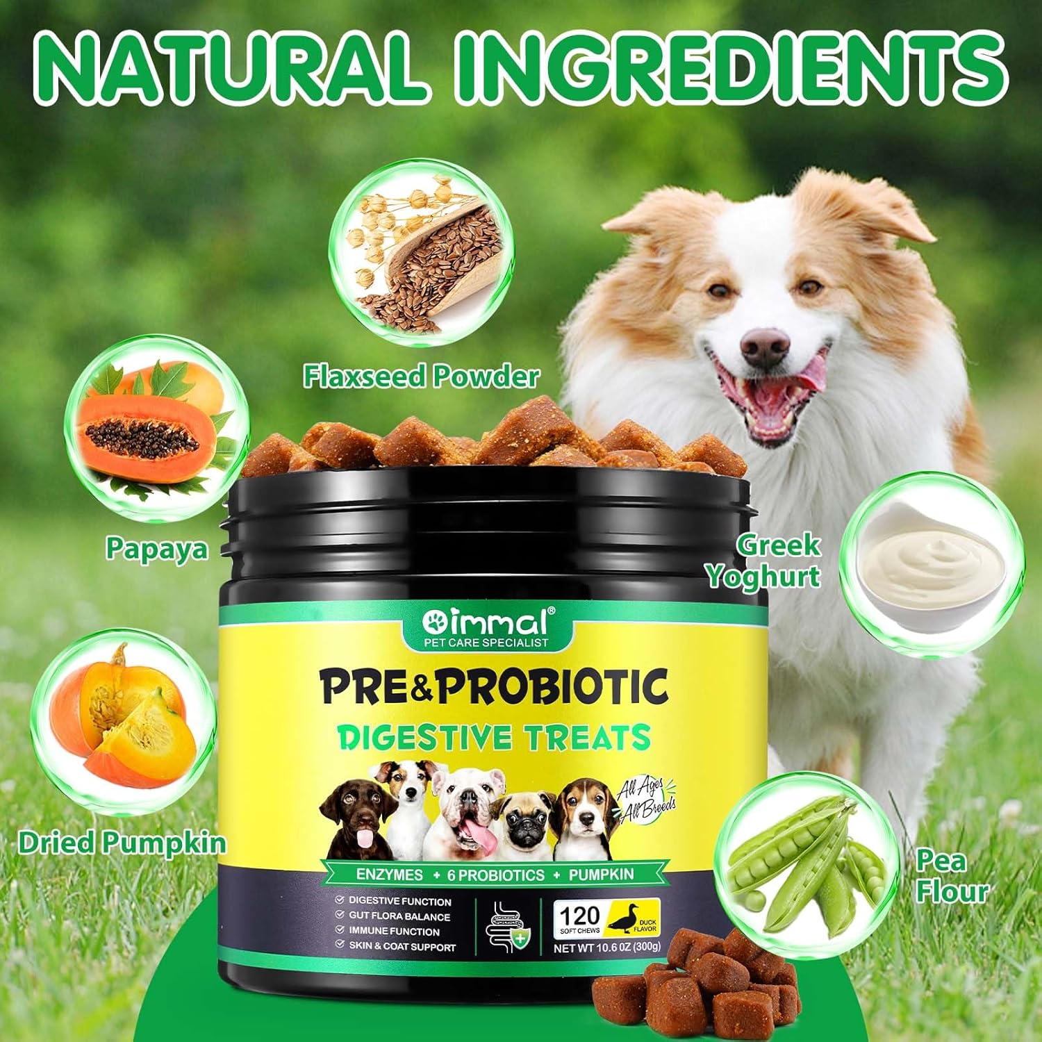 • 【Натуралната закуска】Нашите пробиотични дъвчащи таблетки за кучета съдържат натурални съставки като сушена тиква, папая, ленено семе и гръцко кисело мляко. Нашите дъвчащи закуски не съдържат изкуствени подобрители на вкуса, а вместо това използват натурални аромати. Това осигурява на вашето куче вкусна и лесно смилаема закуска с мека текстура и популярния вкус на патешко месо.