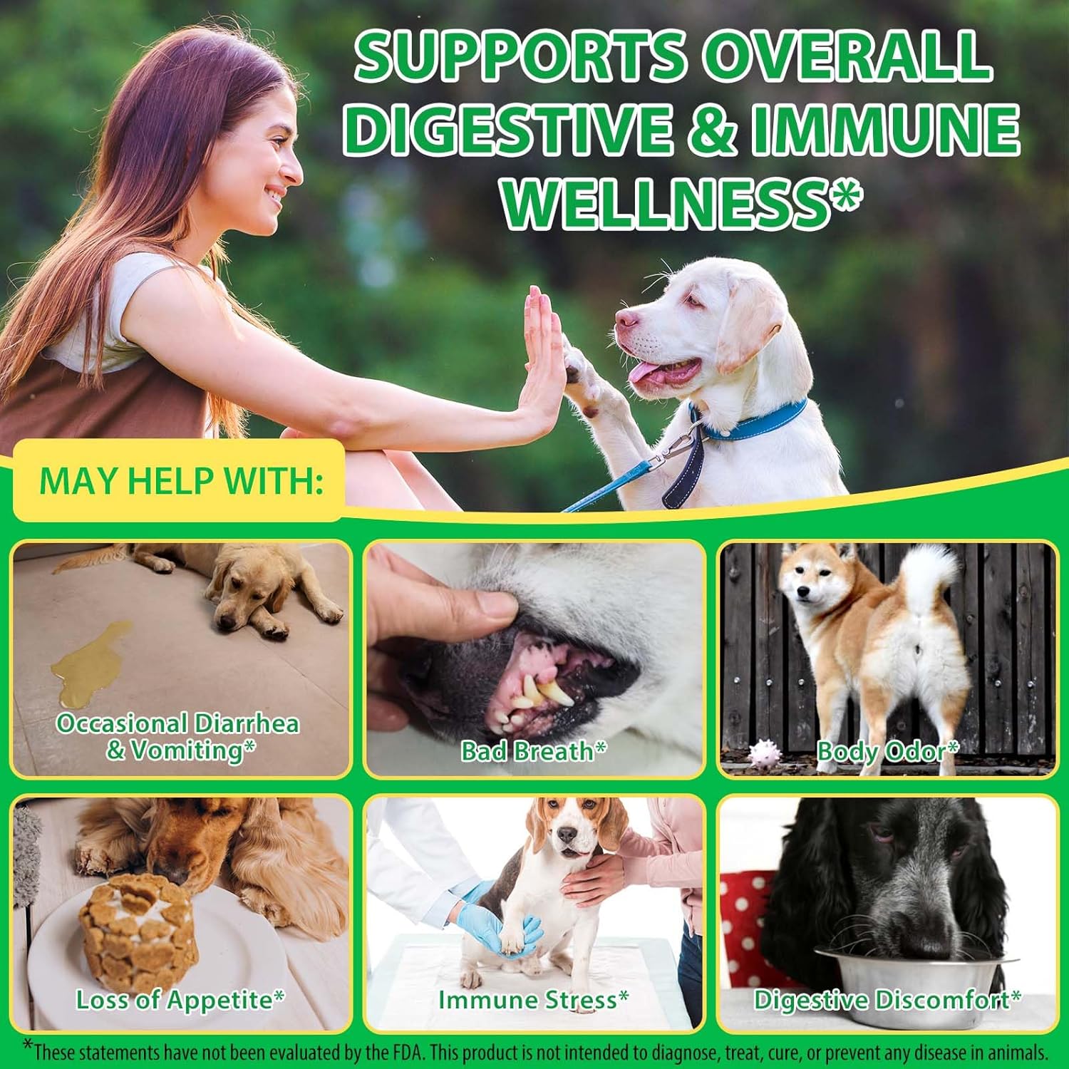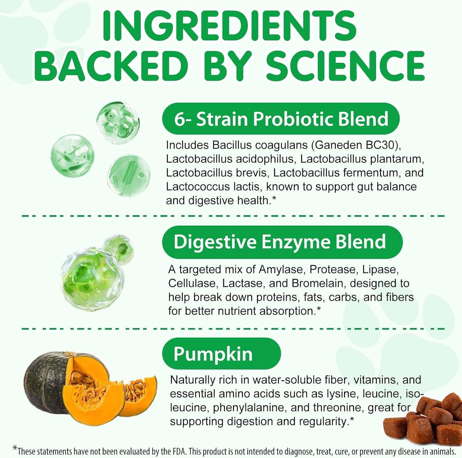• 【Ензимна помощ за храносмилането】Нашата пробиотична формула за кучета, специална за храносмилане, комбинира пробиотици с пребиотици (PreforPro) и комплекс от 6 храносмилателни ензима (амилаза, протеаза, липаза и др.). Тази синергия подпомага здравословната храносмилателна функция и може да оптимизира усвояването на хранителни вещества от храната, което е особено полезно за кучета с чувствителен стомах.