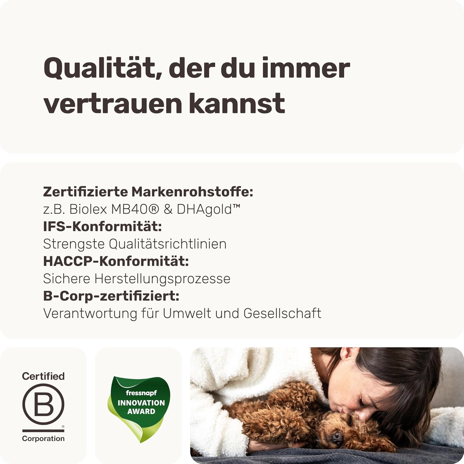 Pflanzliches Glycerin, Reis, hydrolysierte Hühnerleber 10%, Karotte, FOS und Inulin (Fibrofos™ 60) 4,6%, Flohsamenschalen 4,0%, Omega-3-Fettsäuren-Präparat (DHAgold™) 2,9%, Leinsamen, Algen, MOS und Betaglucane (BIOLEX® MB40) 2,1%, Geflügelfett, Naturmoor getrocknet, Kamillenblüten, Melisse, Fenchel 0,9%, Kümmel 0,6%. Ernährungsphysiologische Zusatzstoffe: Vitamin E 2190 mg/kg (Zootechnische Zusatzstoffe: Darmflorastabilisator Enterococcus faecium (DSM 10663 NCIMB 10415) 1,0 x 10^11 KbE/kg). Analytische Bestandteile: Rohprotein 12,50%, Rohfett 8,50%, Rohasche 4%, Rohfaser 3%, Feuchtigkeit 24%