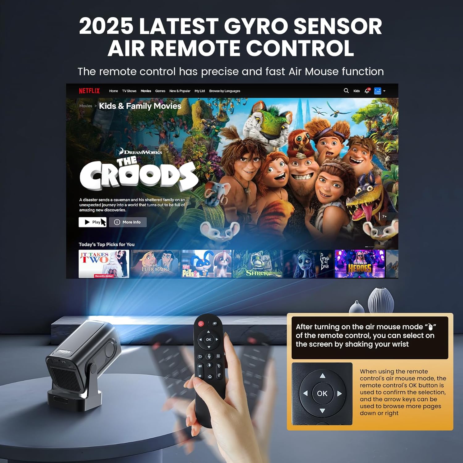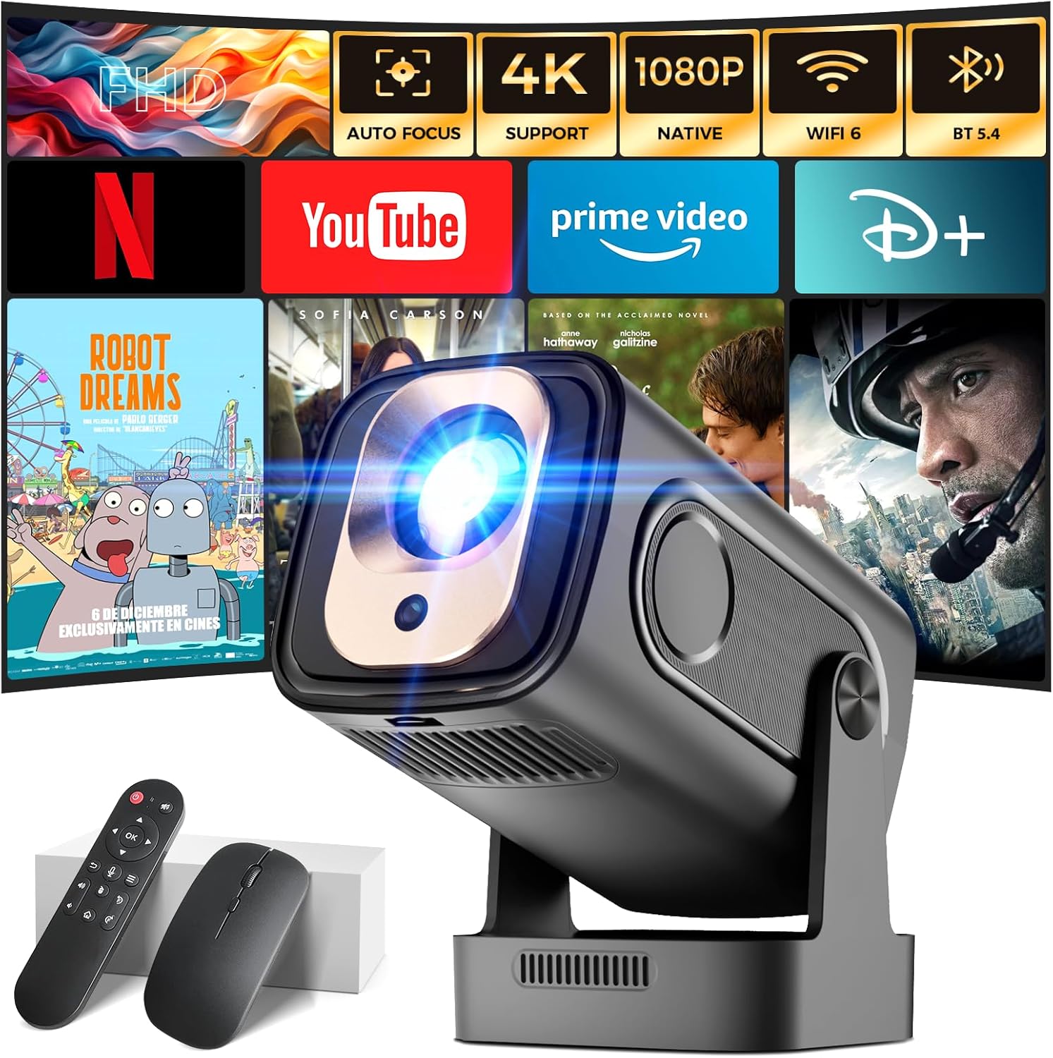 Проектор [1080P Native & Auto Focus & 2025 Model & Integrated Apps] Мини проектор с 4K поддръжка и WiFi 6 Bluetooth 5.4 Air Remote, преносим, ​​съвместим с HDMI/TV Stick/Memory Stick/лаптоп