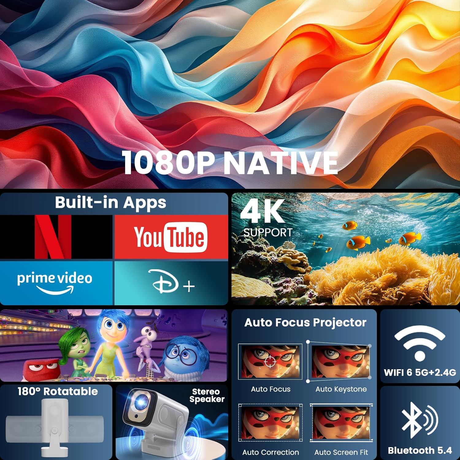Проектор [1080P Native & Auto Focus & 2025 Model & Integrated Apps] Мини проектор с 4K поддръжка и WiFi 6 Bluetooth 5.4 Air Remote, преносим, ​​съвместим с HDMI/TV Stick/Memory Stick/лаптоп