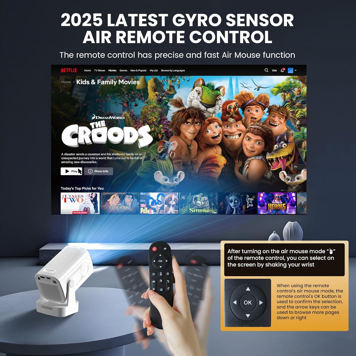 • Проектор с функция Air Remote и интегрирани приложения: дистанционното управление на преносимия мини проектор wowlink W206 има функция Air Remote, която е базирана на жироскопска технология. Можете да управлявате екрана на проектора, като просто разклатите китката си. Мини проекторът W206 има вградени приложения като Netflix, Prime Video, YouTube и D+. Можете да гледате филми и видеоклипове само с едно щракване и без външни устройства и да се наслаждавате на впечатляващо аудиовизуално домашно кино по всяко време и навсякъде.