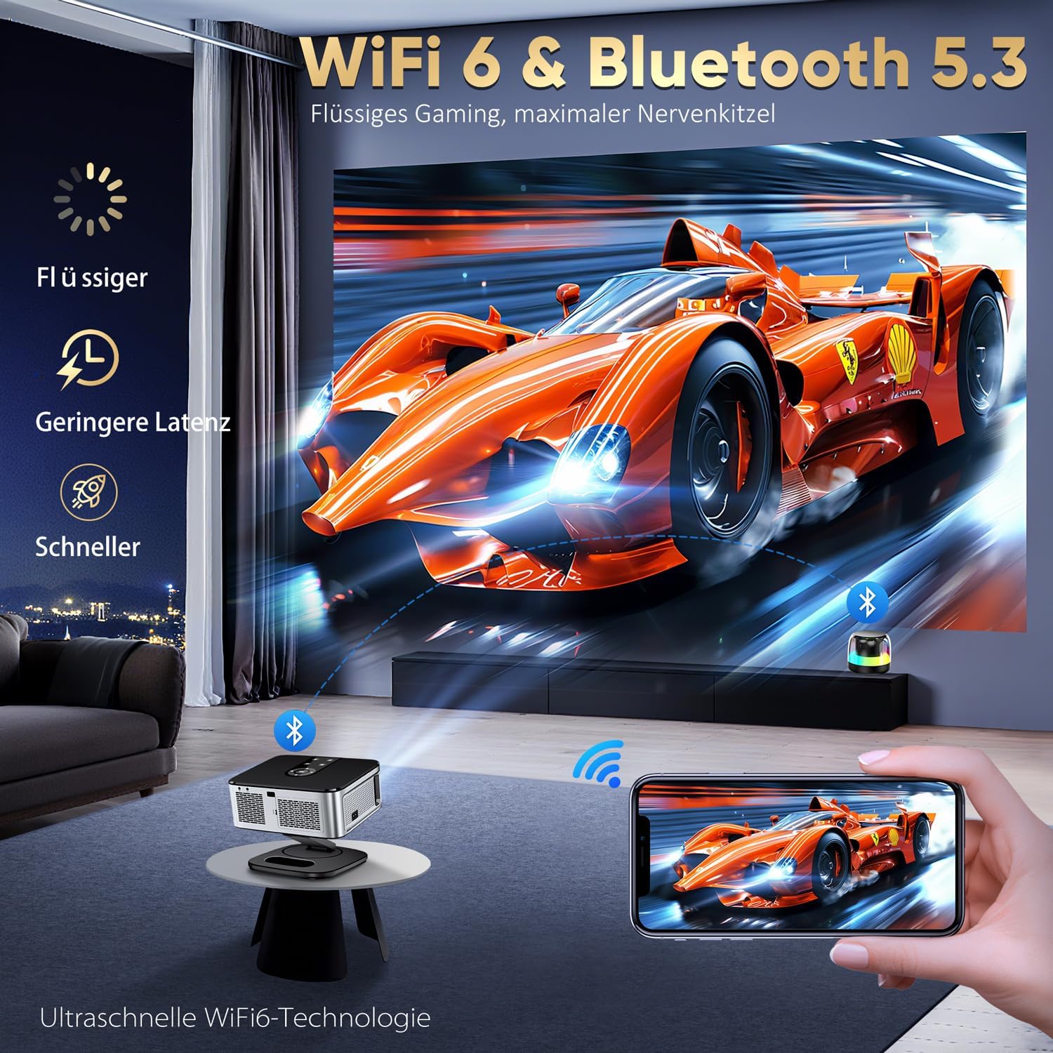 • WiFi 6 огледално изображение и Bluetooth 5.2: WiFi Bluetooth проекторът използва двубандова WiFi 6 технология, за да приема WiFi сигнали на две честоти едновременно, което подобрява скоростта на предаване и плавността на възпроизвеждането. Ако искате да огледално изобразите екрана на вашия смартфон, за да гледате филми, трябва само да конфигурирате WiFi огледалното изображение и проекторът може лесно да се свърже с iOS/Android устройства. Вграден Bluetooth. 5.2 чип 5. Можете да се свържете безжично с BT слушалки/високоговорители/Airpods по всяко време.