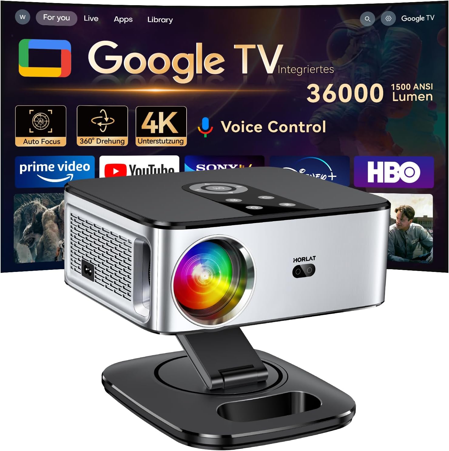 Проектор 【1500 ANSI и Google TV/Netflix Official】 HORLAT Проектор 4K Домашно Кино, Full HD 1080P WiFi6 Bluetooth, Автофокус/Трапецовидна Корекция, Гласово Управление, HDR10, Проектор с 360° Завъртане