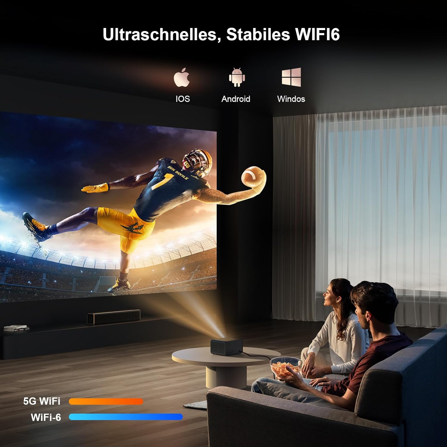 • Перфектен за употреба на закрито и открито – вашият универсален професионалист в развлеченията: идеалният спътник за всеки повод. Независимо дали става въпрос за уютна филмова вечер в хола, вълнуващо гледане на филми в градината или спонтанно парти край басейна – мини проекторът 4k овладява всичко. Интуитивното управление, здравата конструкция и впечатляващата производителност го правят перфектният подарък за семейството и приятелите, който гарантира ентусиазъм.