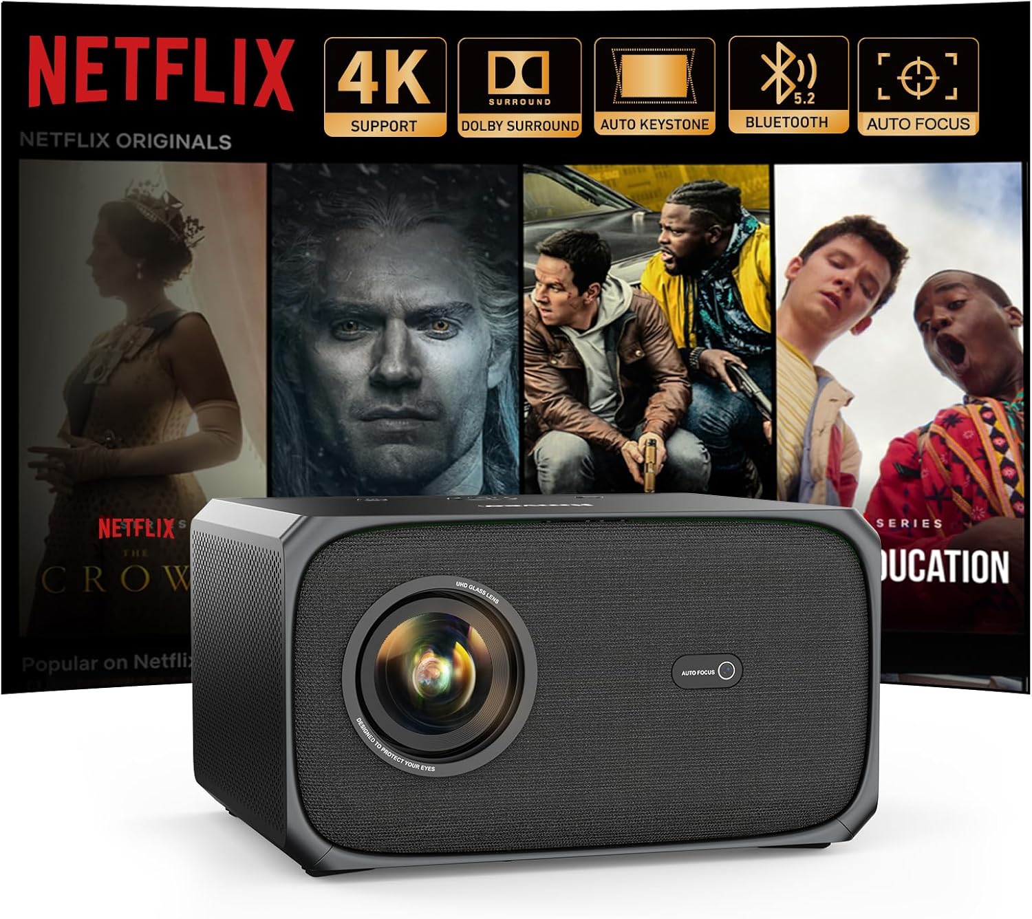 Проектор 4K, подходящ за Netflix, Dolby Audio 35000L 1080P FHD, интелигентен проектор за домашно кино, AI автофокус и трапецовидна корекция, Jimveo проектор с двупосочен Bluetooth, WiFi 6, външен, 300 инча