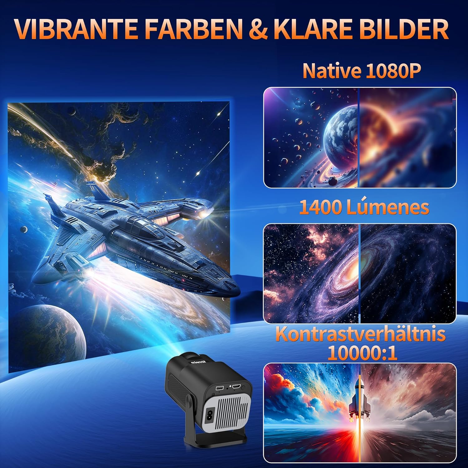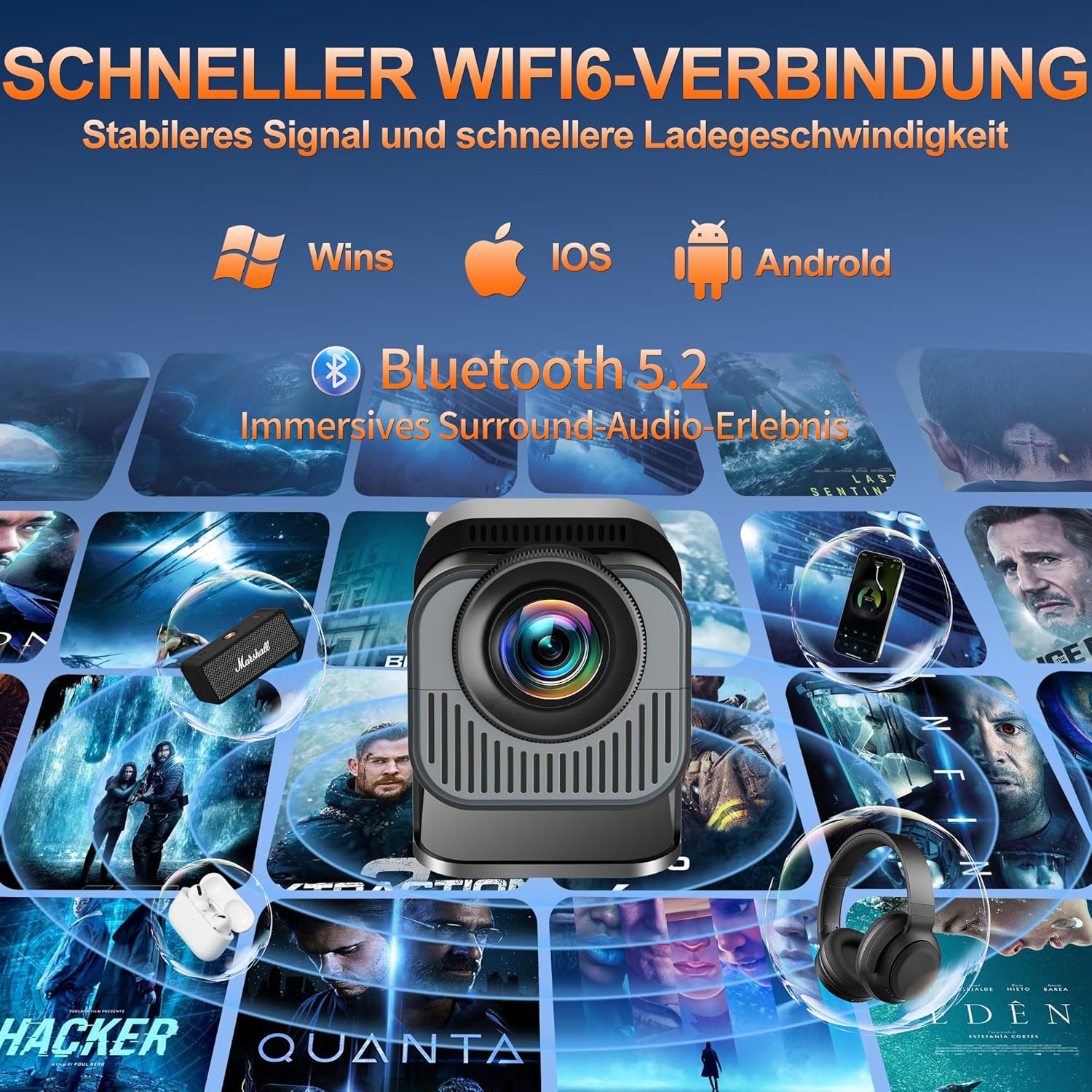• Проектор с Bluetooth 5.2: Системата за качество на звука и интелигентните функции на преносимия проектор nonete предлагат още по-големи предимства. Вградените високоговорители осигуряват зашеметяващ стереоскопичен съраунд звук, който добавя завладяващо усещане към филма. Благодарение на Bluetooth 5.2 чипа, можете да свържете проектора си със слушалки, високоговорители или други аудио устройства, за да се потопите в света на забавленията.