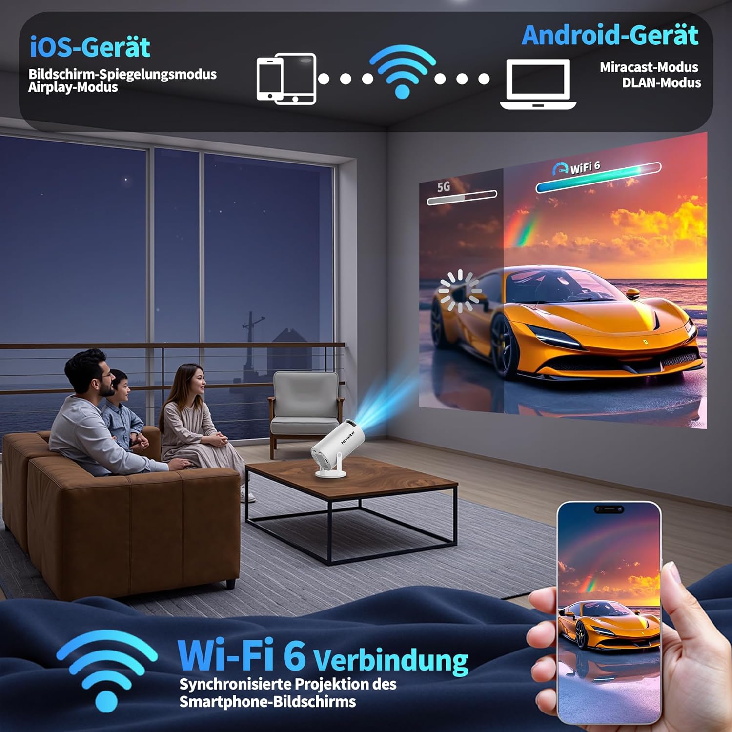 • Проектор с WiFi 6: Кажете сбогом на традиционното преобразуване на проектор чрез HDMI кабел. Интелигентният видео проектор с вграден WiFi6 поддържа двубандови връзки (2.4GHz и 5GHz) с най-съвременна безжична технология. Ултрабърза и лесна връзка със смартфони, лаптопи и др., за да можете да проектирате видеоклипове, да играете игри и да гледате филми бързо и стабилно без забавяне.