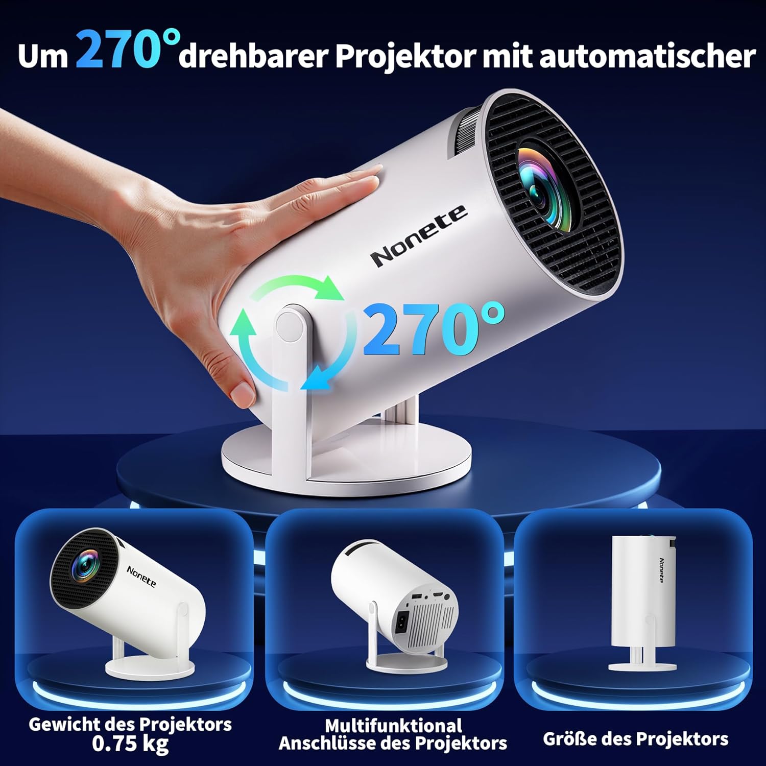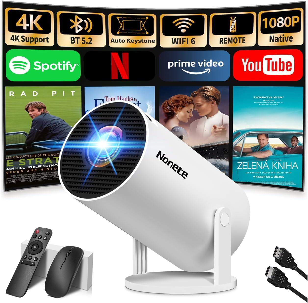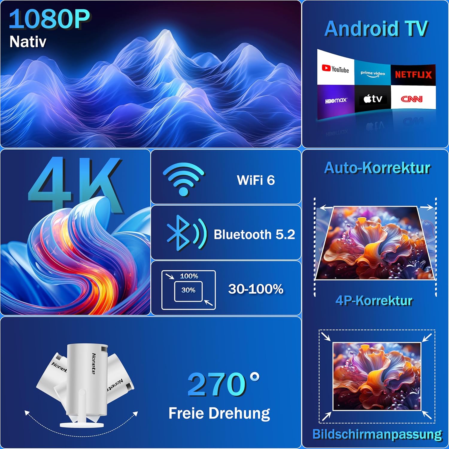 Проектор 4K проектор Full HD 1080P мини проектор с WiFi 6 и Bluetooth 5.2, преносим Android проектор с 270° въртене с автоматична трапецовидна корекция за PC/HDMI/USB, с мишка и дистанционно управление