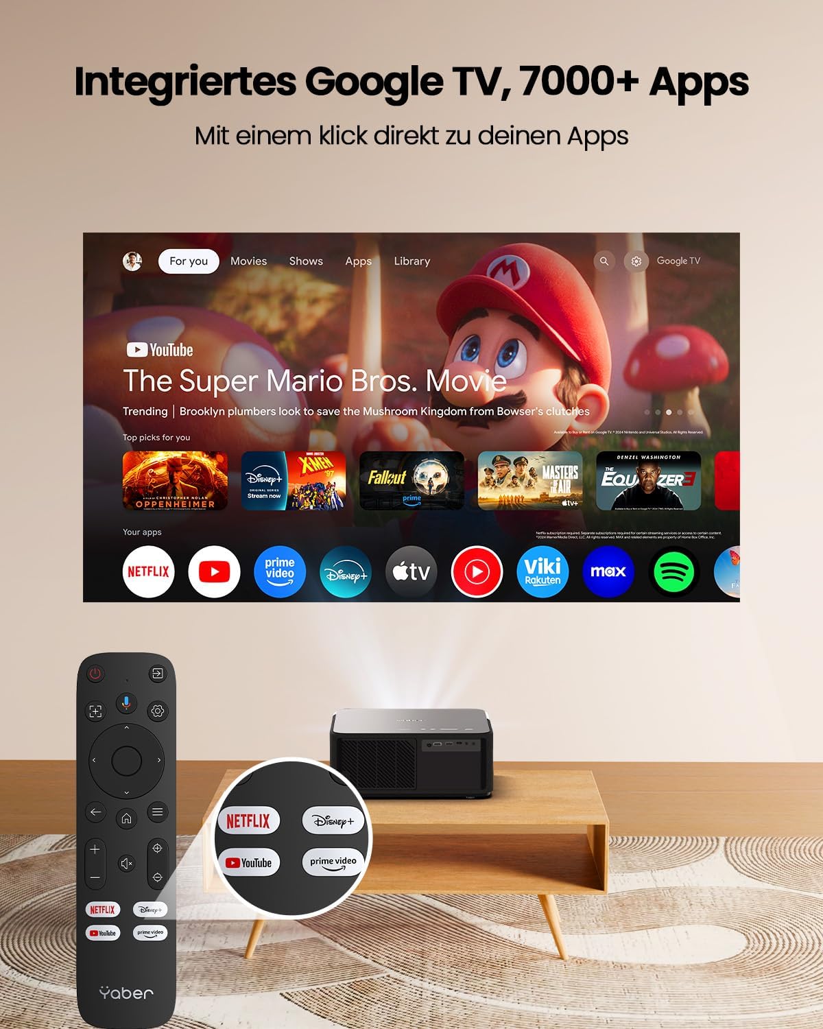 • Нативен 1080P full HD проектор и TV адаптер с над 7000 приложения: Проекторът YABER K2s има номинална резолюция от 1920 x 1080 пиксела, поддържа 4K 60Hz видеоклипове и е ултра ярък. С над 7000 приложения, включително популярни стрийминг услуги като Netflix, Youtube и Prime Video, можете лесно да получите достъп до любимите си предавания и филми, без да се свързвате с външно устройство. Безкрайни възможности за забавление за цялото семейство!