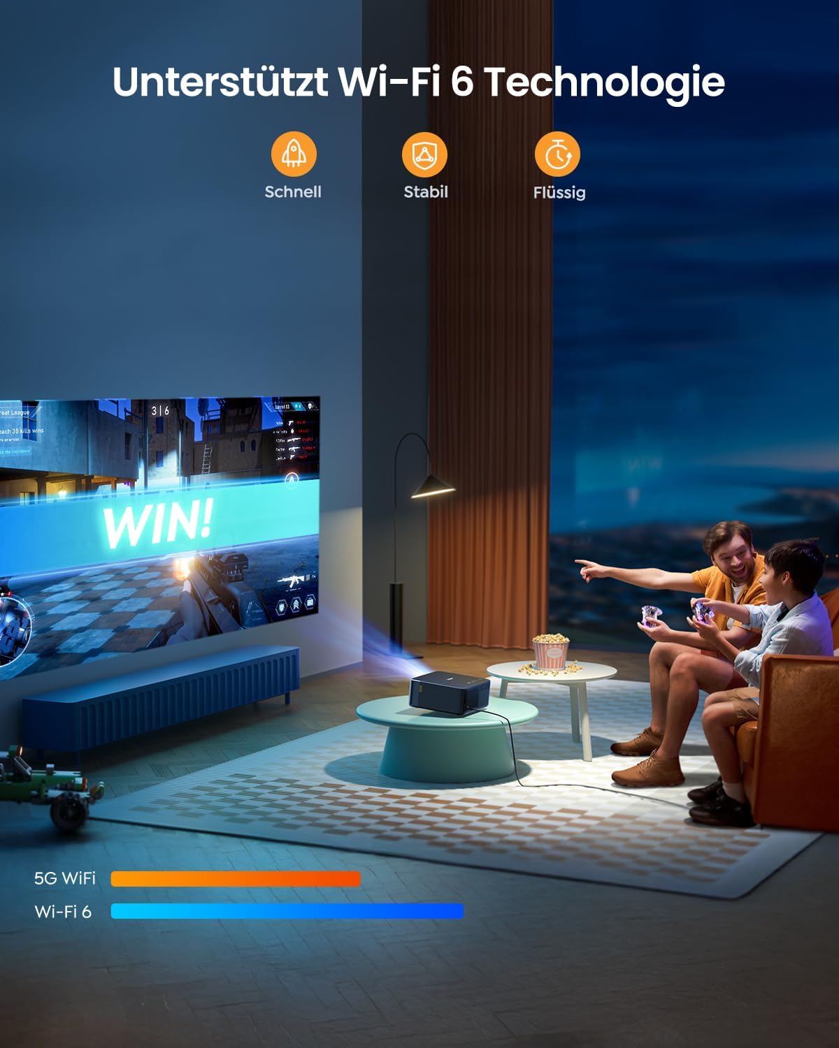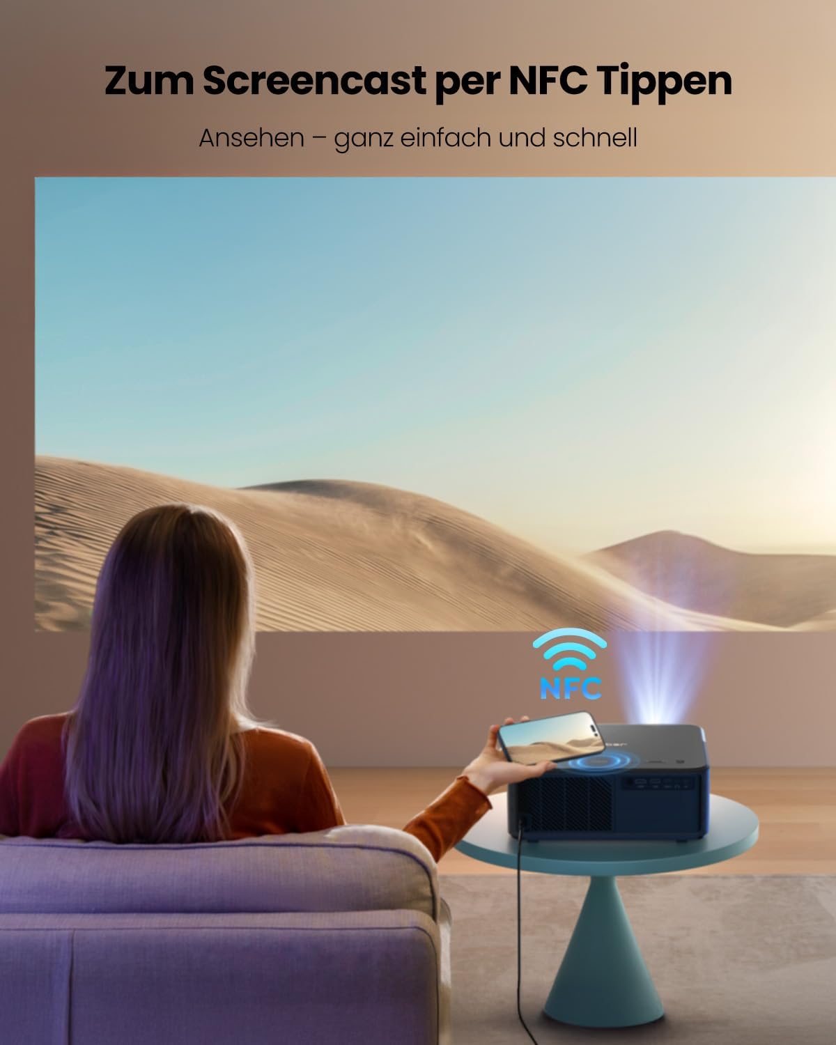 • Първа иновация NFC screencast & Wi-Fi 6 & Bluetooth 5.2: Ексклузивна NFC технология. Благодарение на NFC функцията и Bluetooth 5.2 чиповете на проектора, трябва само да докоснете устройството с NFC до LCD екрана на проектора, за да прехвърлите мултимедията вътре, а LED дисплеят на проектора може да бъде свързан безжично с Bluetooth слушалки/високоговорители/AirPods. Постигнете комфортна и прецизна плавна връзка. 4K проекторът поддържа най-новата Wi-Fi 6 технология, адаптира се към масовите мрежи и бъдещите среди, предоставяйки на потребителите, които използват WiFi mirroring, по-плавен, по-силен сигнал и по-ниско забавяне при гледане.