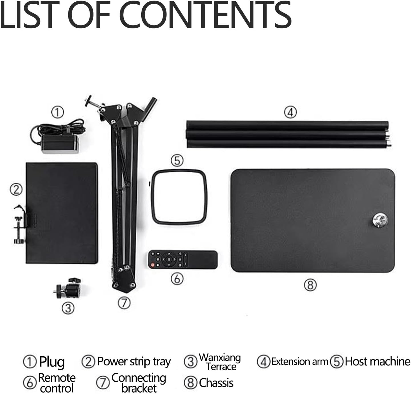 Packing list: 1x plug, 1x power strip tray, 1x multimedia platforms, 1x extension arm, 1x host, 1x remote control, 1x connection bracket, 1x chassis