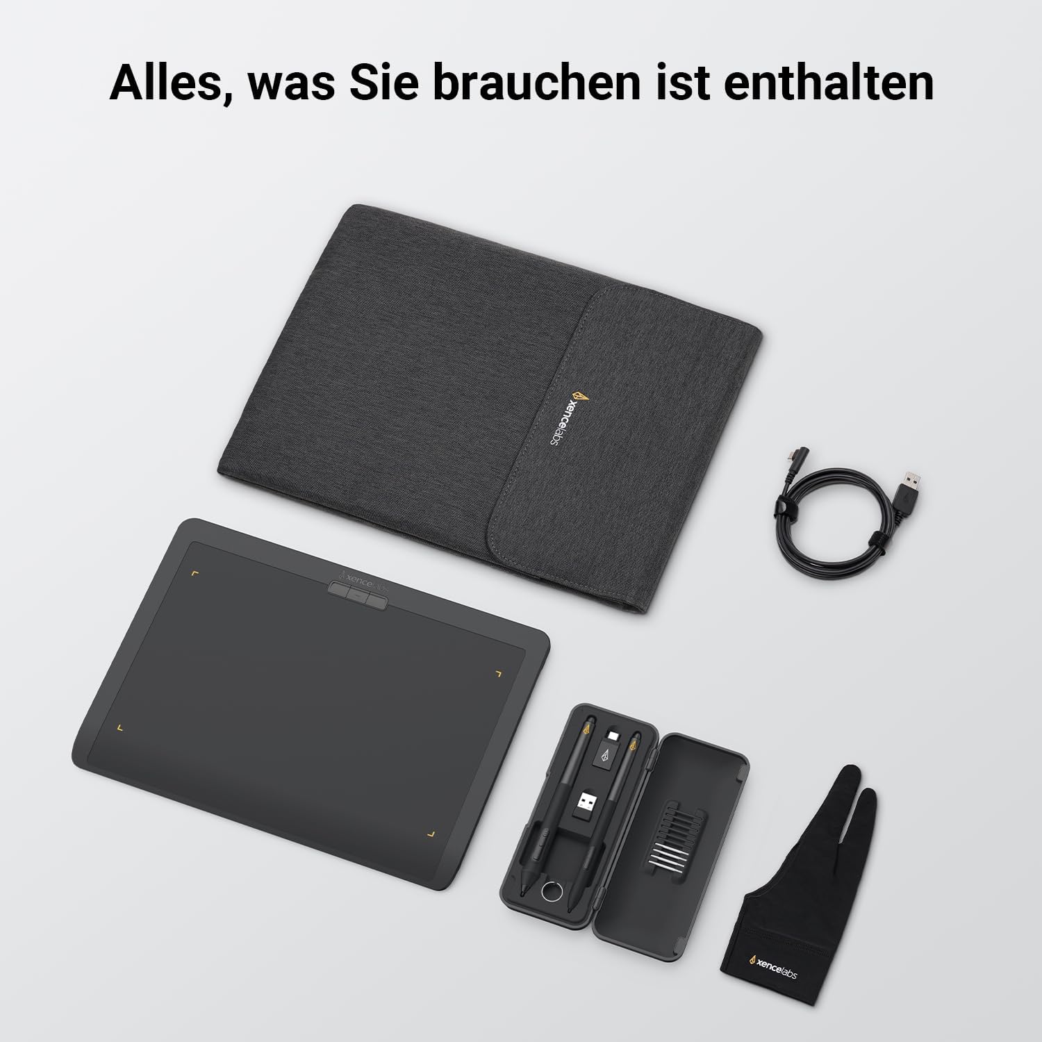 • Комплект аксесоари „всичко в едно“: Всичко освен идеите: Разопаковайте и започнете да творите! Комплектът включва две писалки, 10 пера (6 стандартни, 4 филцови), ръкавица, калъф, Bluetooth адаптер – дори слот за заключване Kensington за студиа. Не са необходими допълнителни покупки: Оборудвали сме го с професионални инструменти.