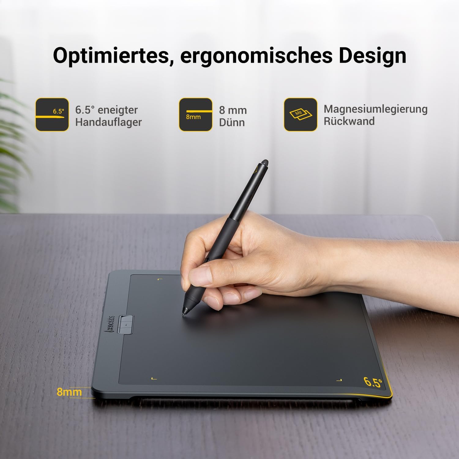 • Ергономичен дизайн: Кажете сбогом на болката в китката: Извитата на 6,5° опора за длани е повече от просто дизайн – тя облекчава дискомфорта по време на дълги сесии на рисуване. С дебелина само 8 мм и метална задна плоча, тя е достатъчно лека, за да се побере в раницата ви, но същевременно достатъчно издръжлива за ежедневна употреба. Левичари или десничари? Горните бутони са лесно достъпни за всички.