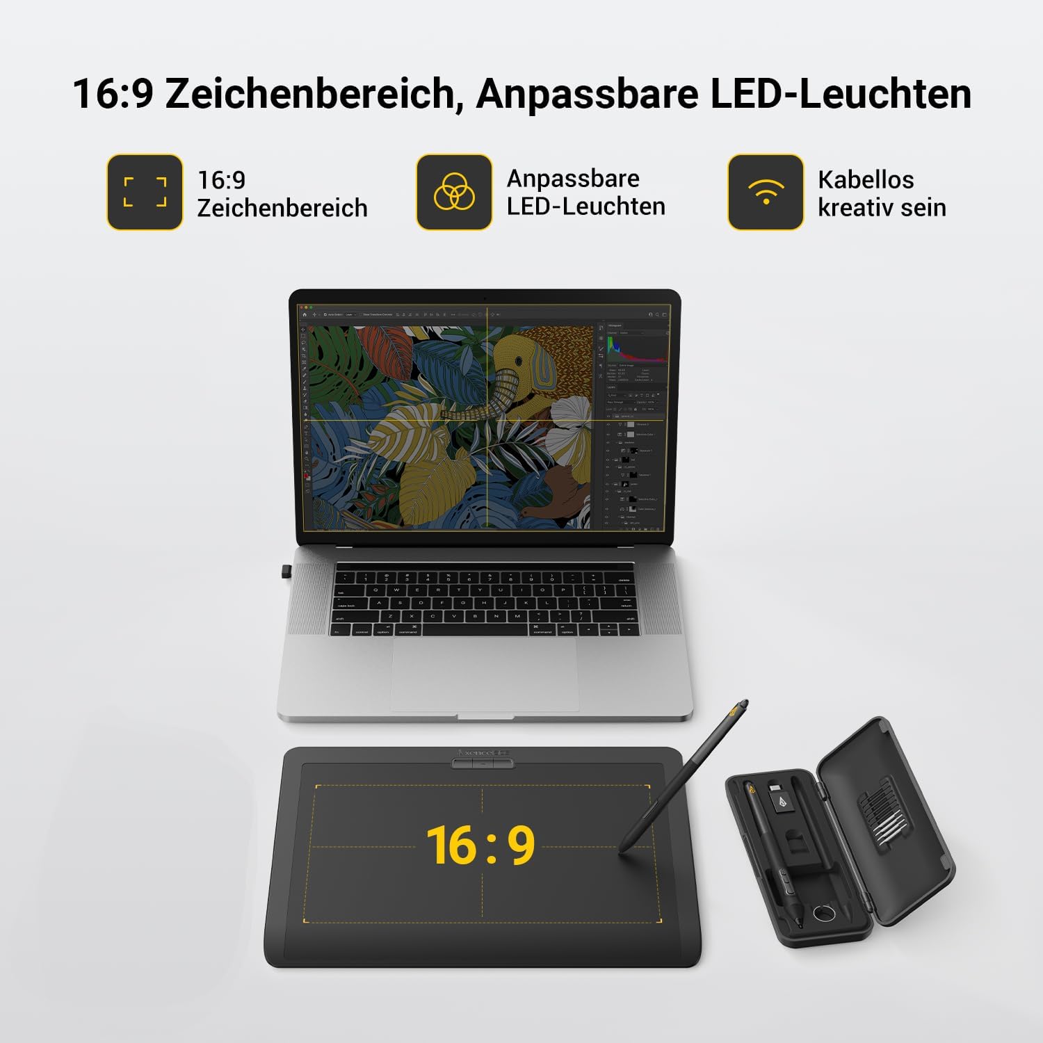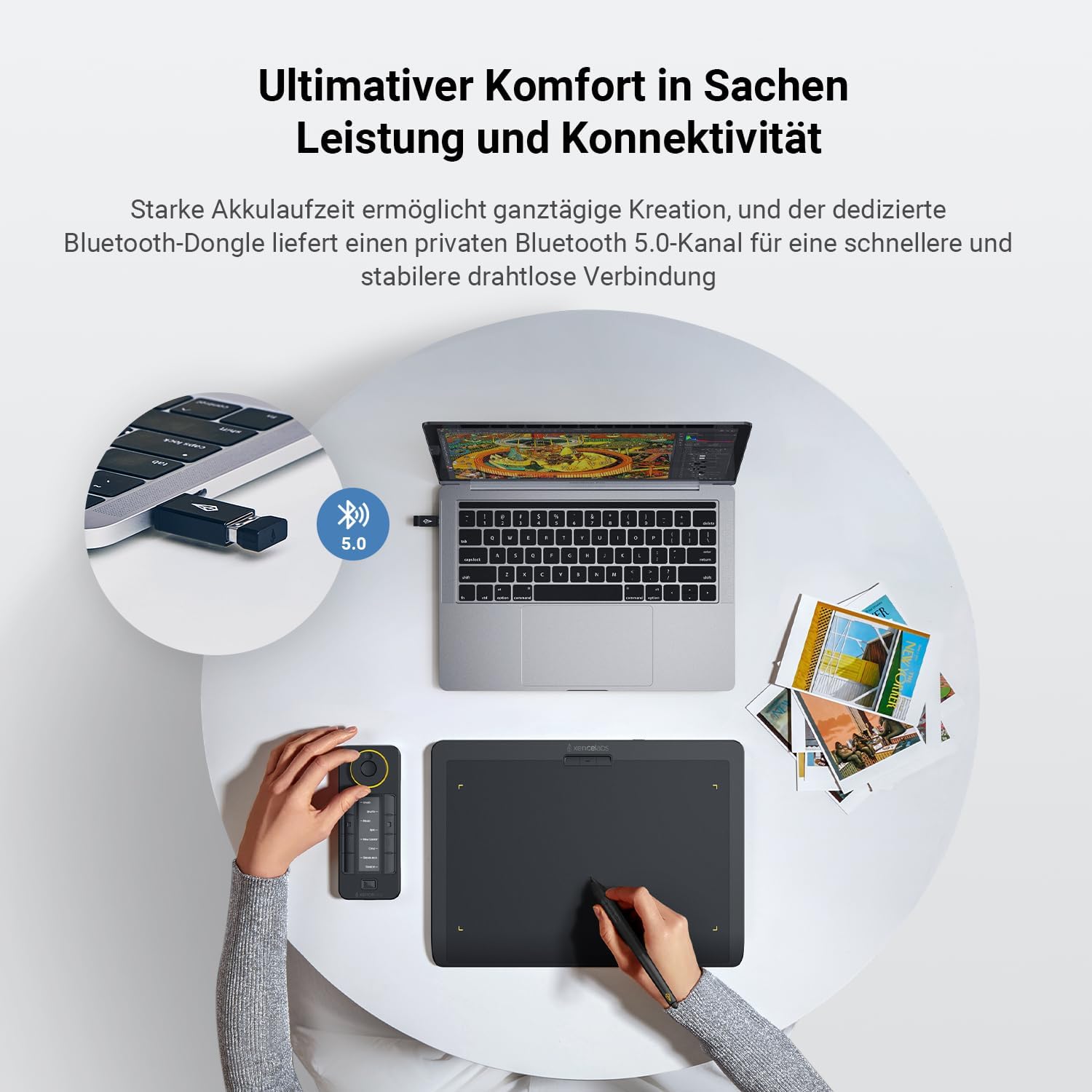 • Безжична свобода с надеждна свързаност: Край на заплетените кабели или прекъснатите връзки! С Bluetooth 5.0 (частен) и специален адаптер, се наслаждавате на изключително стабилна връзка – дори в райони с висока Wi-Fi употреба. Батерията с капацитет 3000 mAh осигурява до 16 часа неограничено време за рисуване с едно зареждане. Така че можете да творите от сутрин до вечер, без постоянно да презареждате.