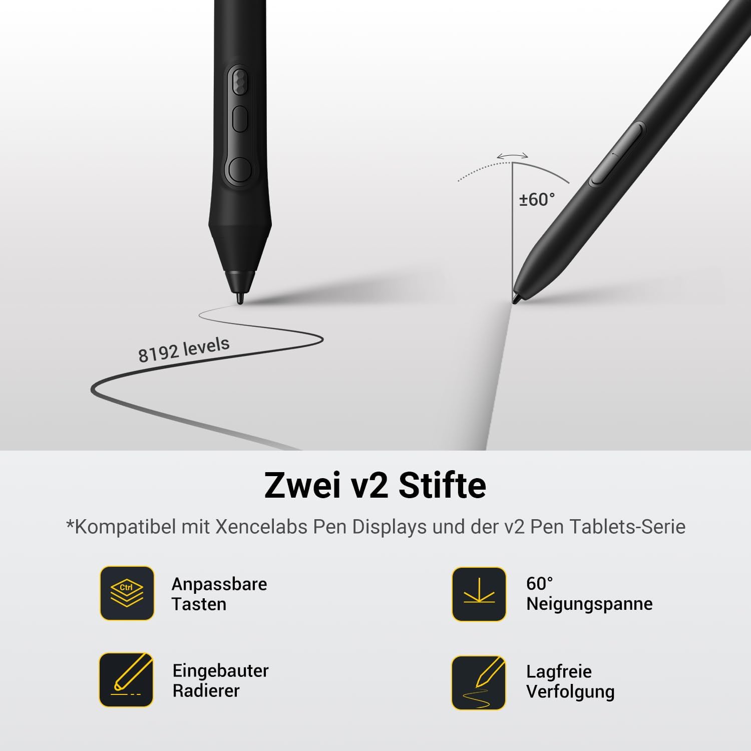 • Две v2 писалки: Персонализиран захват за всеки творчески стил: Край на универсалните писалки! Използвайте две v2 писалки – едната с три бутона и едната тънка – всяка с различни повърхности за захващане, оптимизирани както за десничари, така и за левичари. Благодарение на 8192 нива на натиск, можете да променяте дебелината на линията, точно както с истинска четка за рисуване. Писалките са съвместими и с дисплеи Xencelabs, така че винаги имате резервна, ако една се изгуби, и работният ви процес не се прекъсва.