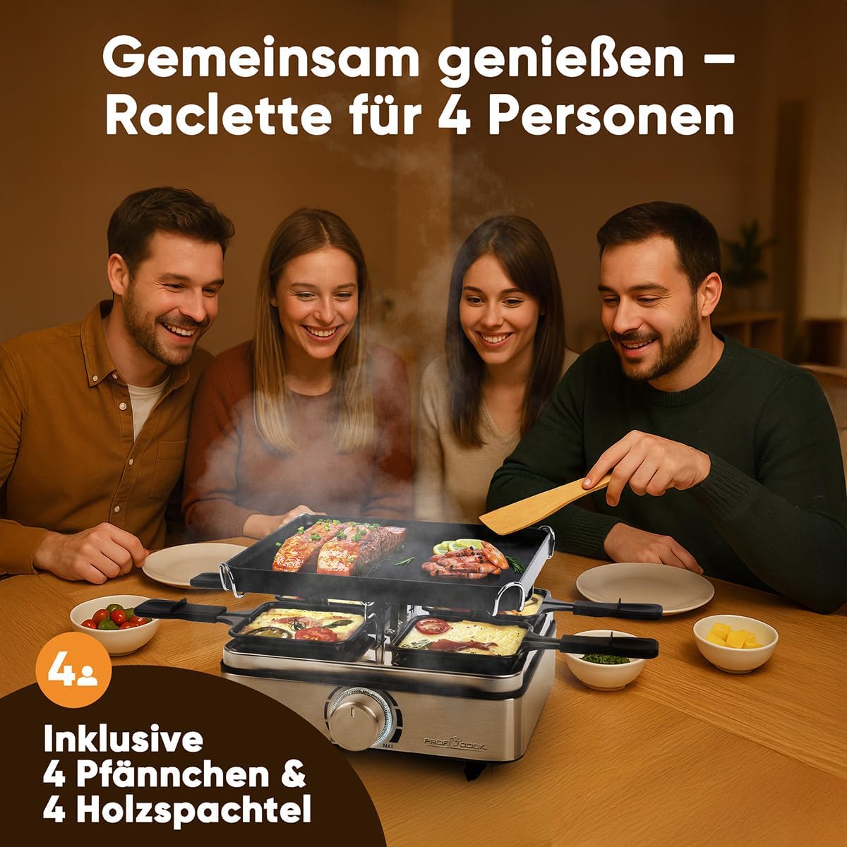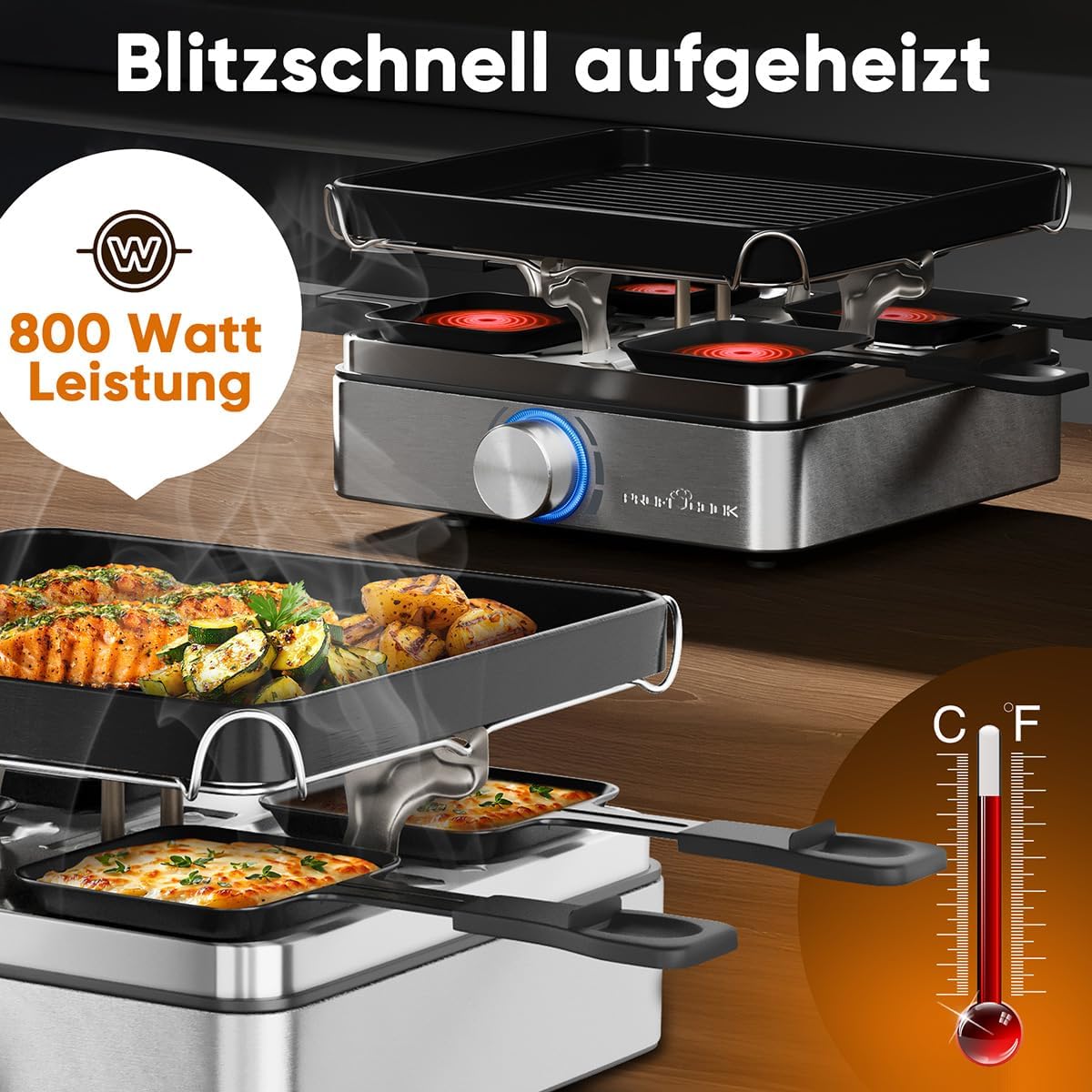 ProfiCook Раклет 4 души | Включва 4 тигана и 4 дървени шпатули | Обратима чугунена плоча за равномерно разпределение на топлината | Раклет 4 тигана | Безстепенно регулируем термостат | 800 W | PC RG 1301