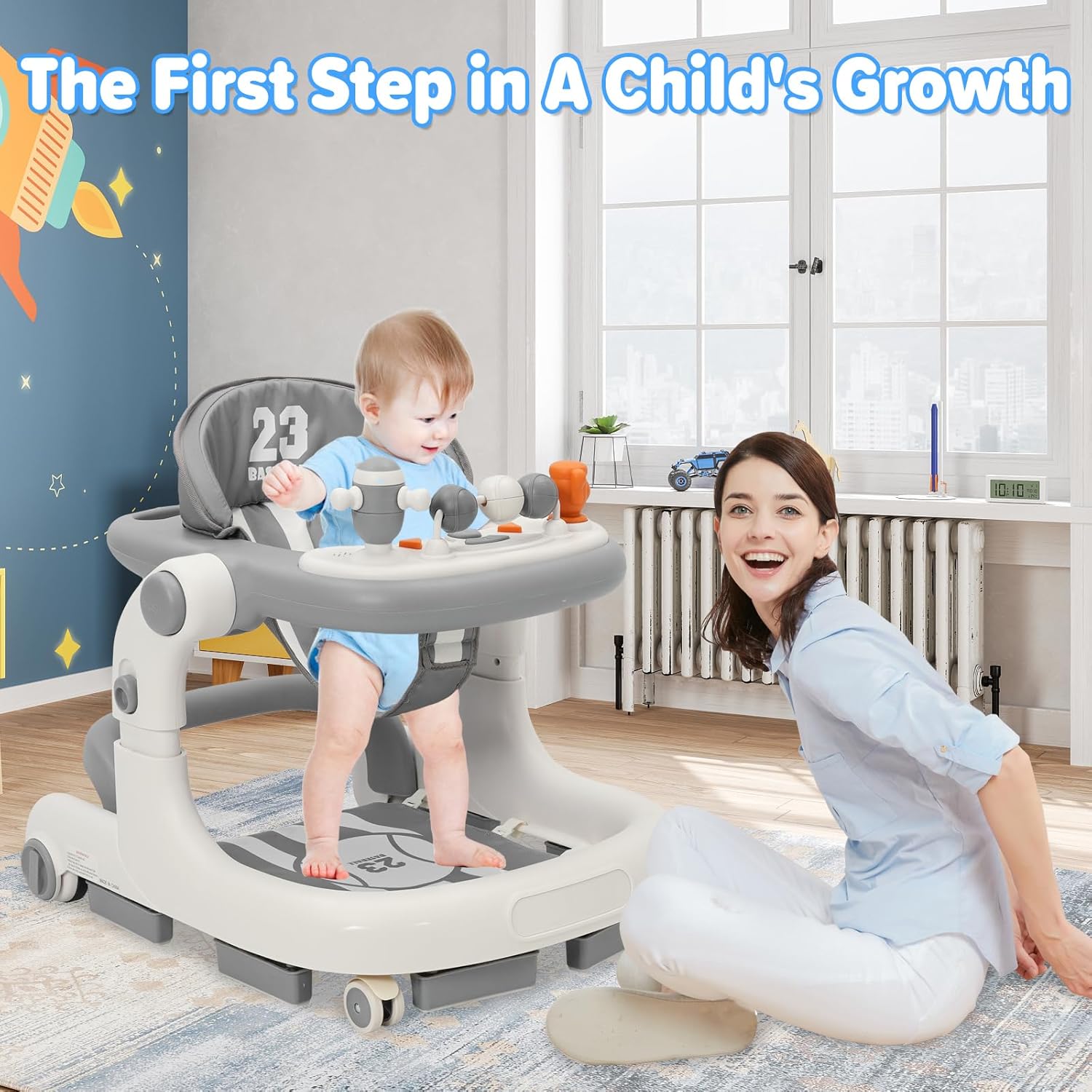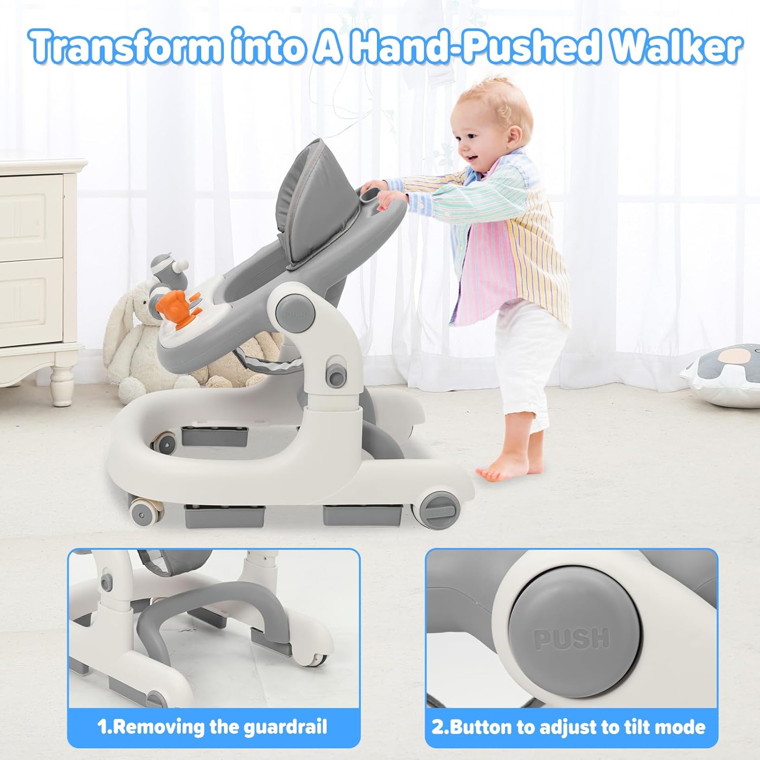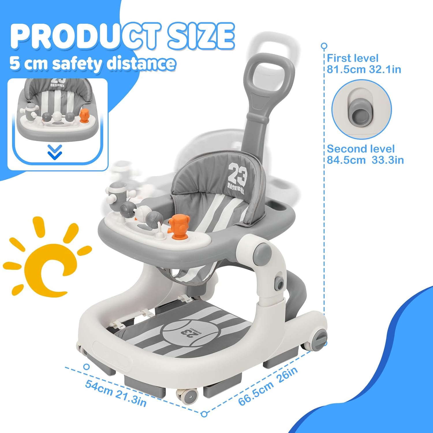 Проходилка за бебета Siairo 3 в 1 с регулируема височина и скорост, колела, светлина, музика, за деца на възраст от 6 до 18 месеца (сива)