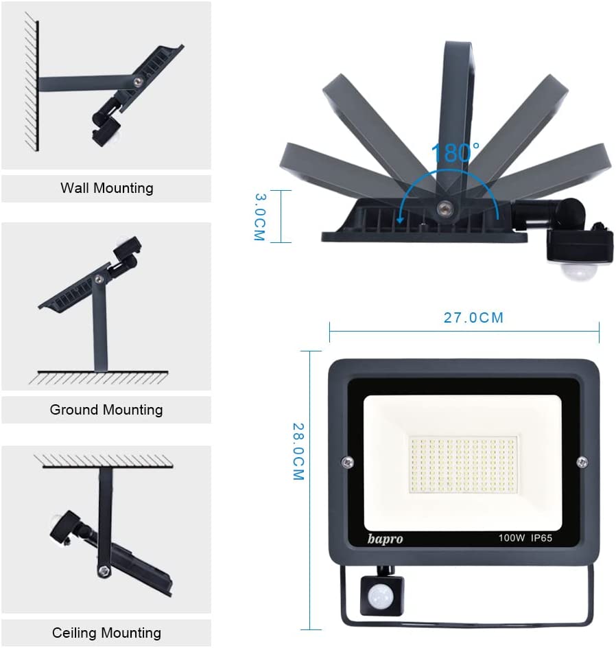 • Детекторът има регулируем ъгъл от 360 ° хоризонтално и 180 ° вертикално. Може да се регулира с металния държач на 180°, LED външният прожектор може да се монтира безопасно навсякъде.