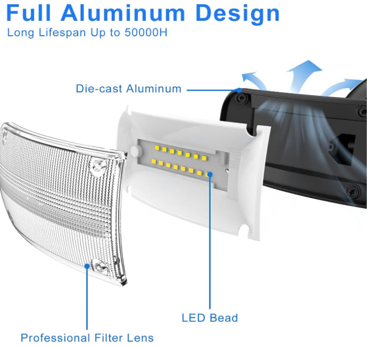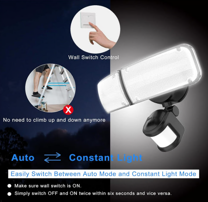 • Висока яркост и енергоспестяване: С 4000LM/5000K (дневна бяла светлина), подобрената LED охранителна лампа осветява над 1600 м² и спестява до 90% електроенергия в сравнение с конвенционалните лампи с нажежаема жичка и халогенни лампи.