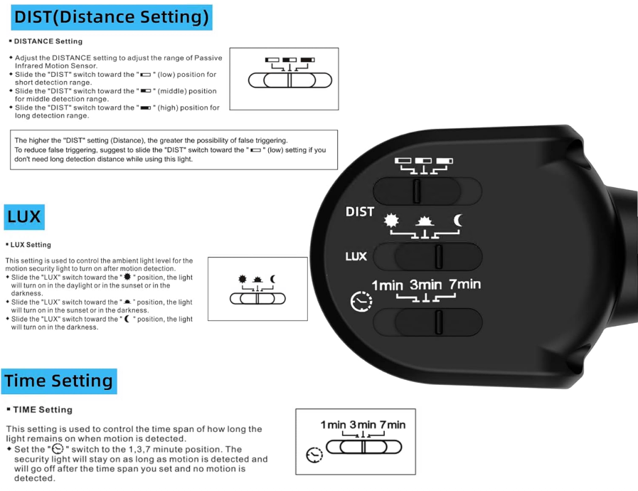 • LUX настройка: С функцията LUX можете да контролирате околната светлина. В позиция "SUN" светлината се включва през деня или на тъмно, в позиция "DUSK" при залез слънце, а в позиция "Moon" само на тъмно.