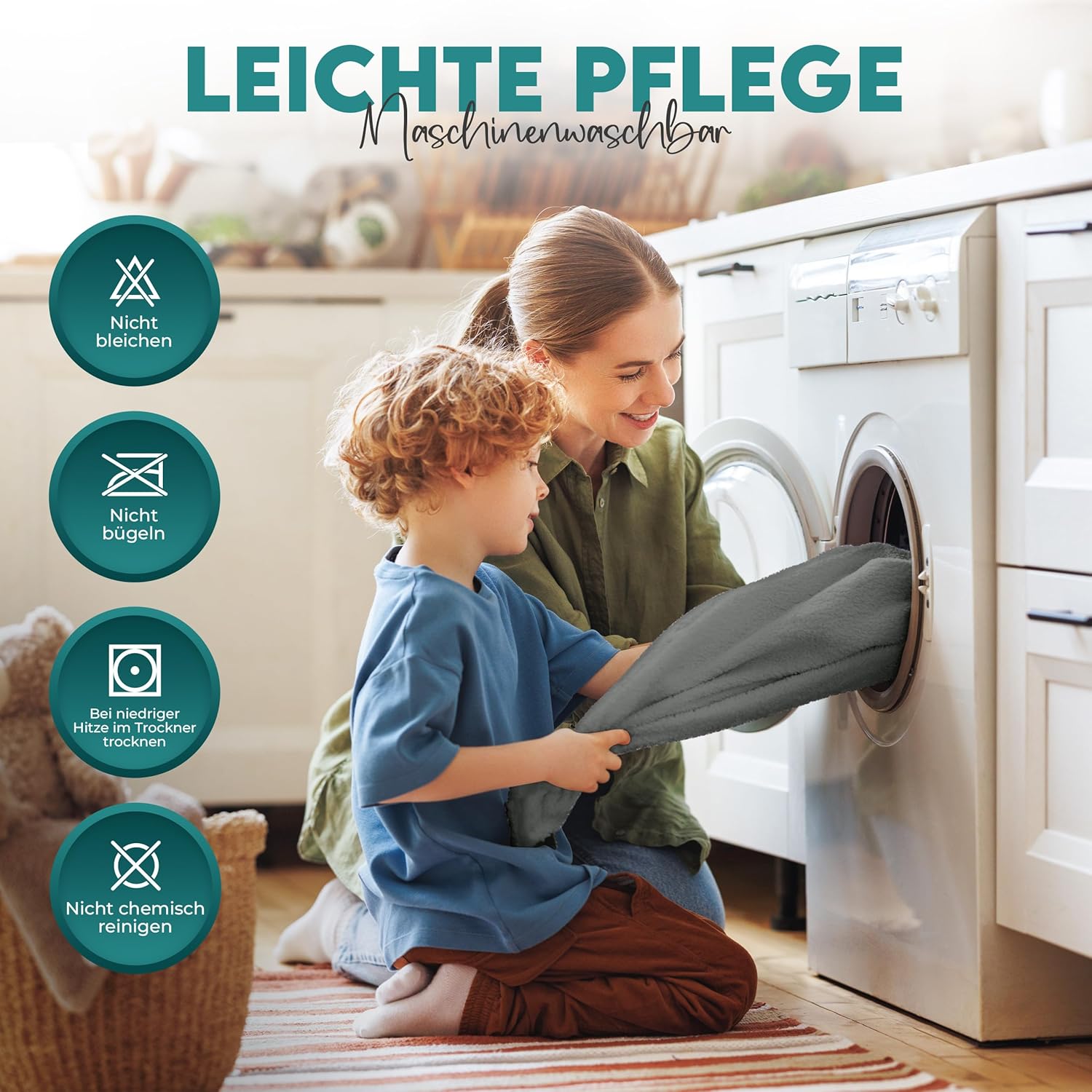Please do not use solvents or bleach, bleach alternatives, chlorine free bleach or bleach products in the detergent, as this will damage the waterproof backing. Do not use fabric softener as it reduces the absorbency of the cotton terry surface.