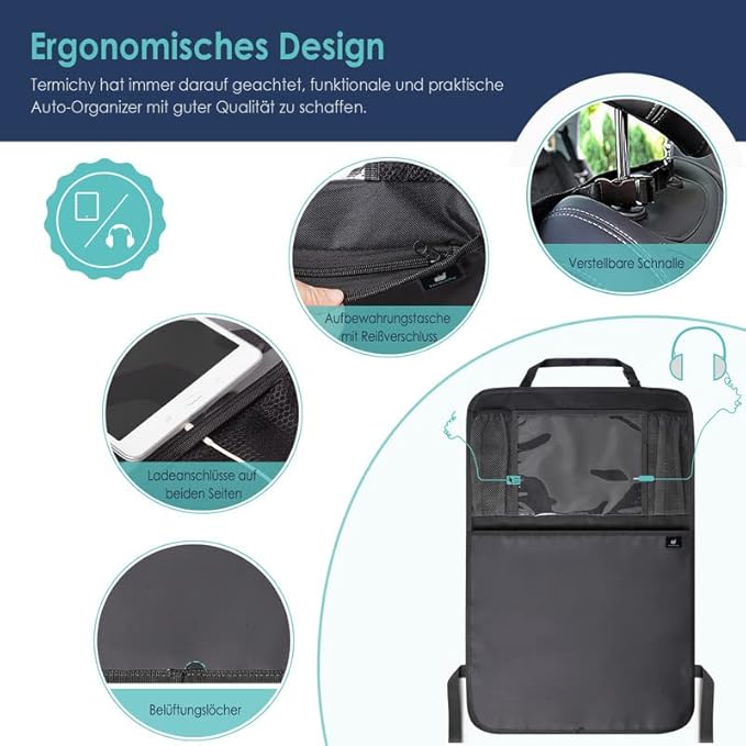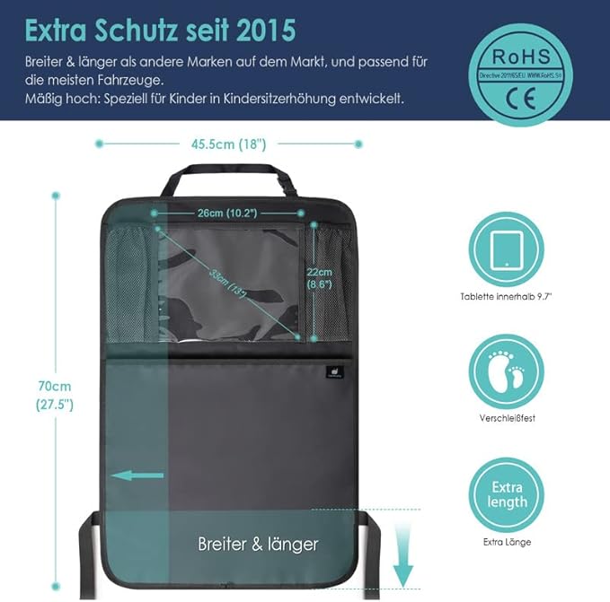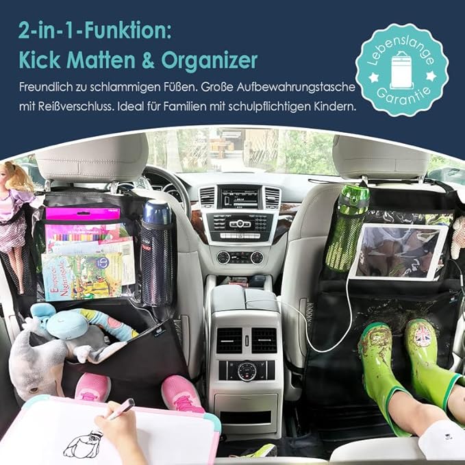 • ПЪЛНА ЗАЩИТА НА ОБЛЕГАЛКАТА - Изключително големият протектор за облегалката с отделения предпазва цялата предна седалка от замърсявания и повреди за безпроблемно шофиране. Той е 100% водоустойчив и лесен за почистване, дори с влажна кърпа.