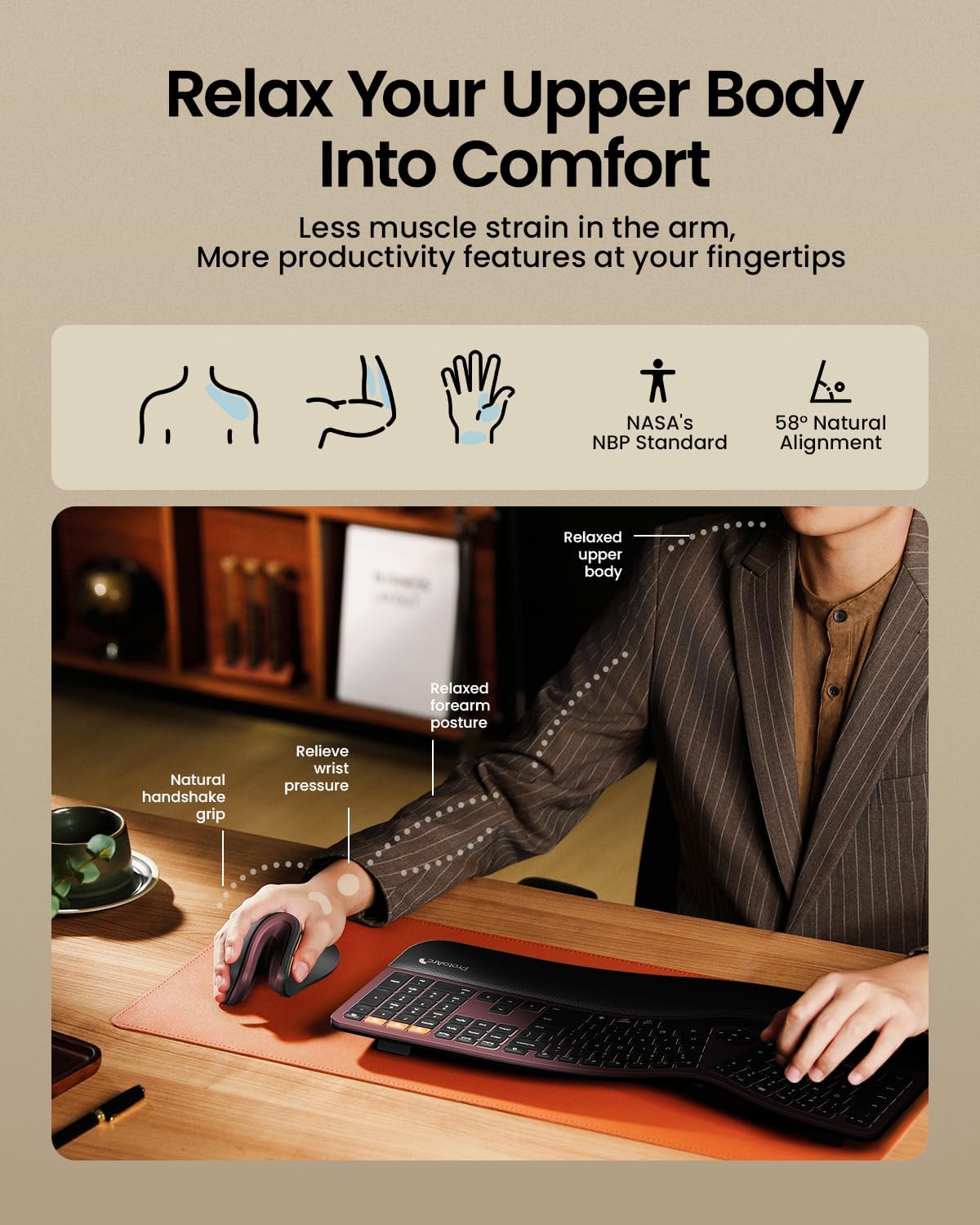 • Ергономичен дизайн и подобрен комфорт: ергономичната безжична мишка има удължена опора за китката, която се адаптира перфектно към дланта ви и позволява по-естествена и релаксираща позиция за китката и предмишницата. Този дизайн помага за намаляване на риска от нараняване от повтарящи се натоварвания и намалява мускулното напрежение в ръцете ви, за да осигури комфорт през целия ден.