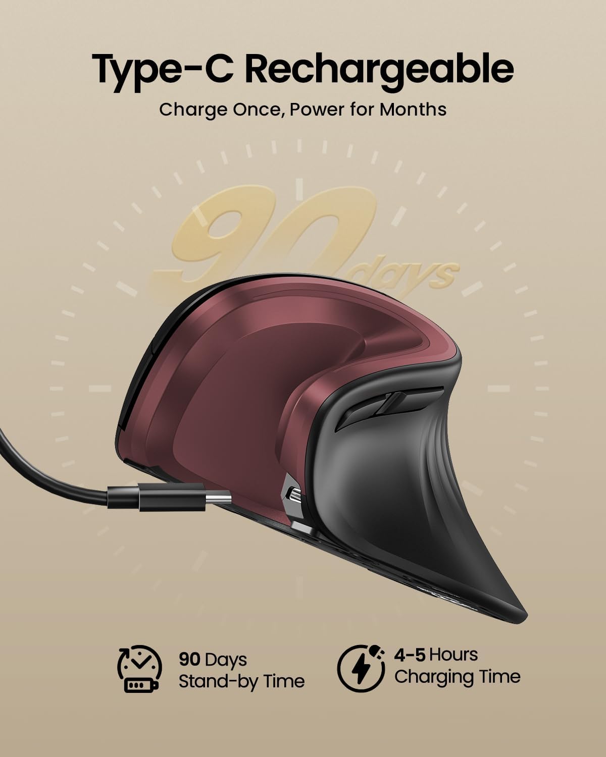 • Акумулаторна батерия: вертикалната Bluetooth мишка е оборудвана с литиево-йонна батерия с капацитет 500 mAh, която се зарежда с включения Type-C кабел. След 30 минути неактивност, мишката автоматично преминава в режим на заспиване, за да пести енергия, и може да се събуди с просто движение. Индикаторът за изтощена батерия ви напомня да заредите мишката, когато червената светлина мига.