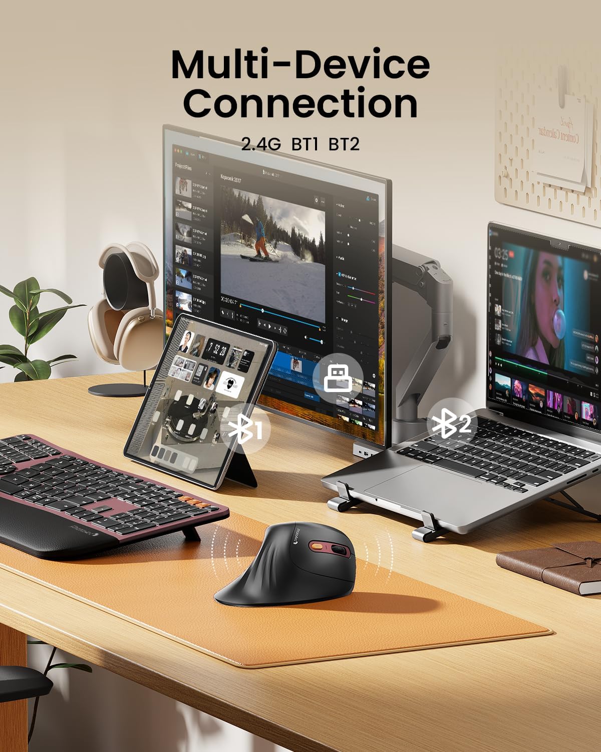 • Свързване на до 3 устройства: Тази ергономична безжична мишка (не е професионална геймърска мишка) предлага двойни режими на свързване BT 5.0 и 2.4G USB, така че можете да свържете до 3 устройства едновременно. Превключването между устройствата се извършва с просто щракване на бутона за превключване на режима. Съвместима с Windows 8, Windows 10, macOS 10.12 или по-нова версия и Android 4.3 или по-нова версия.
