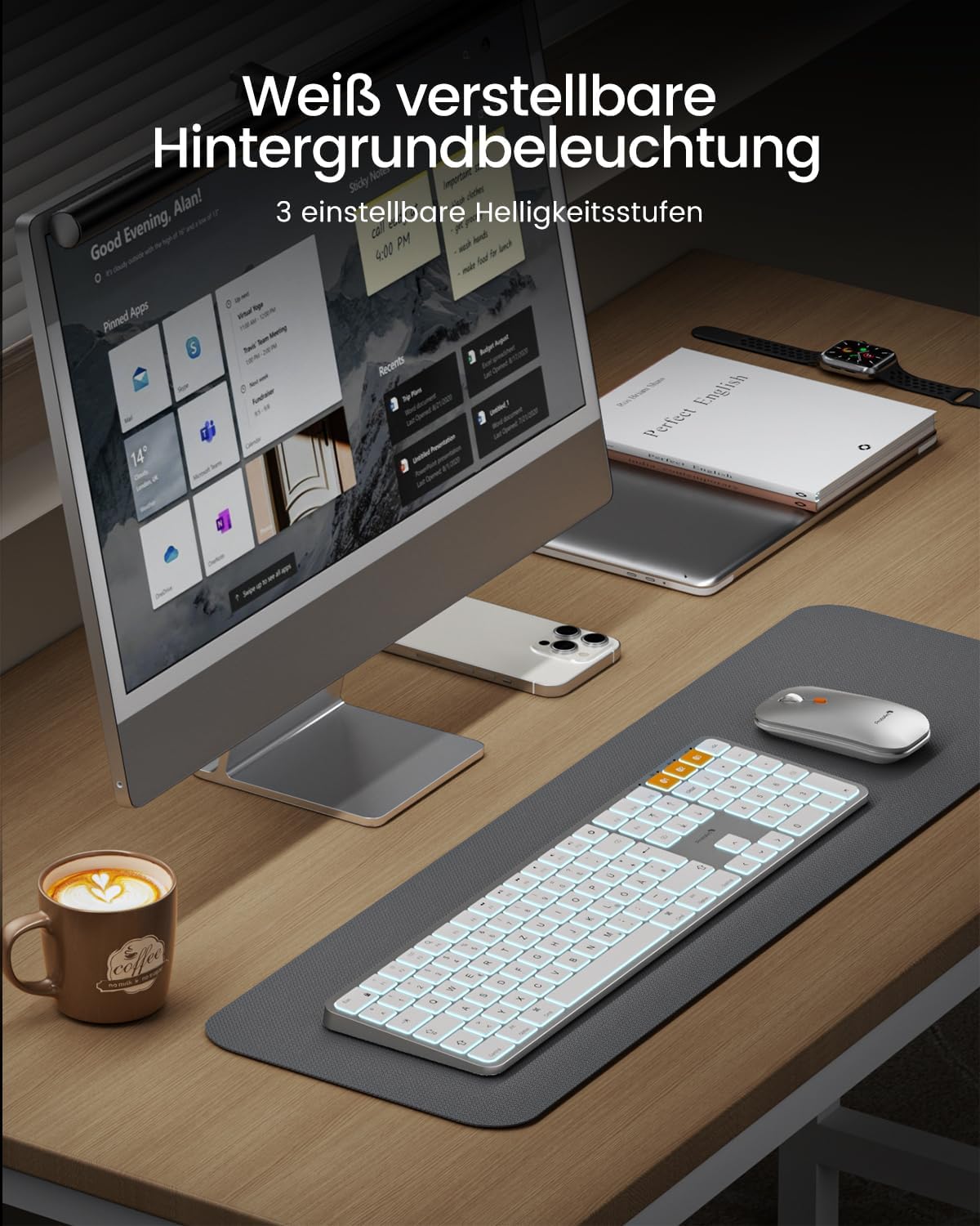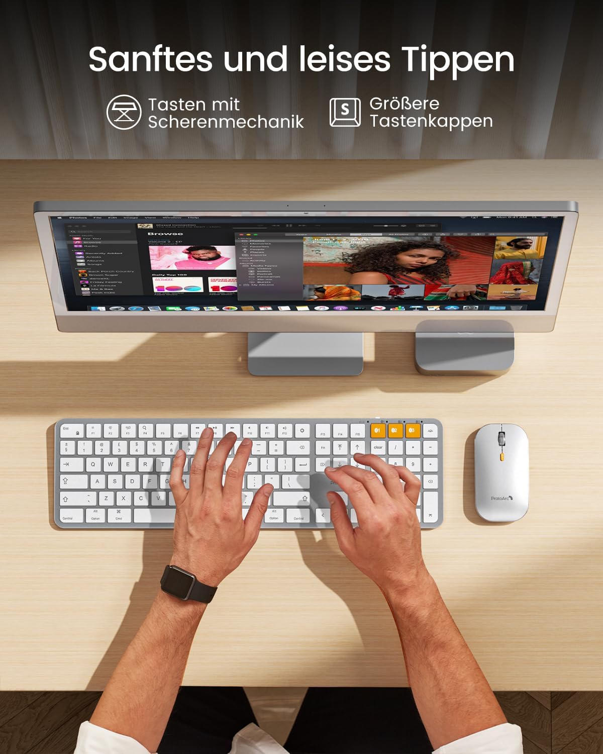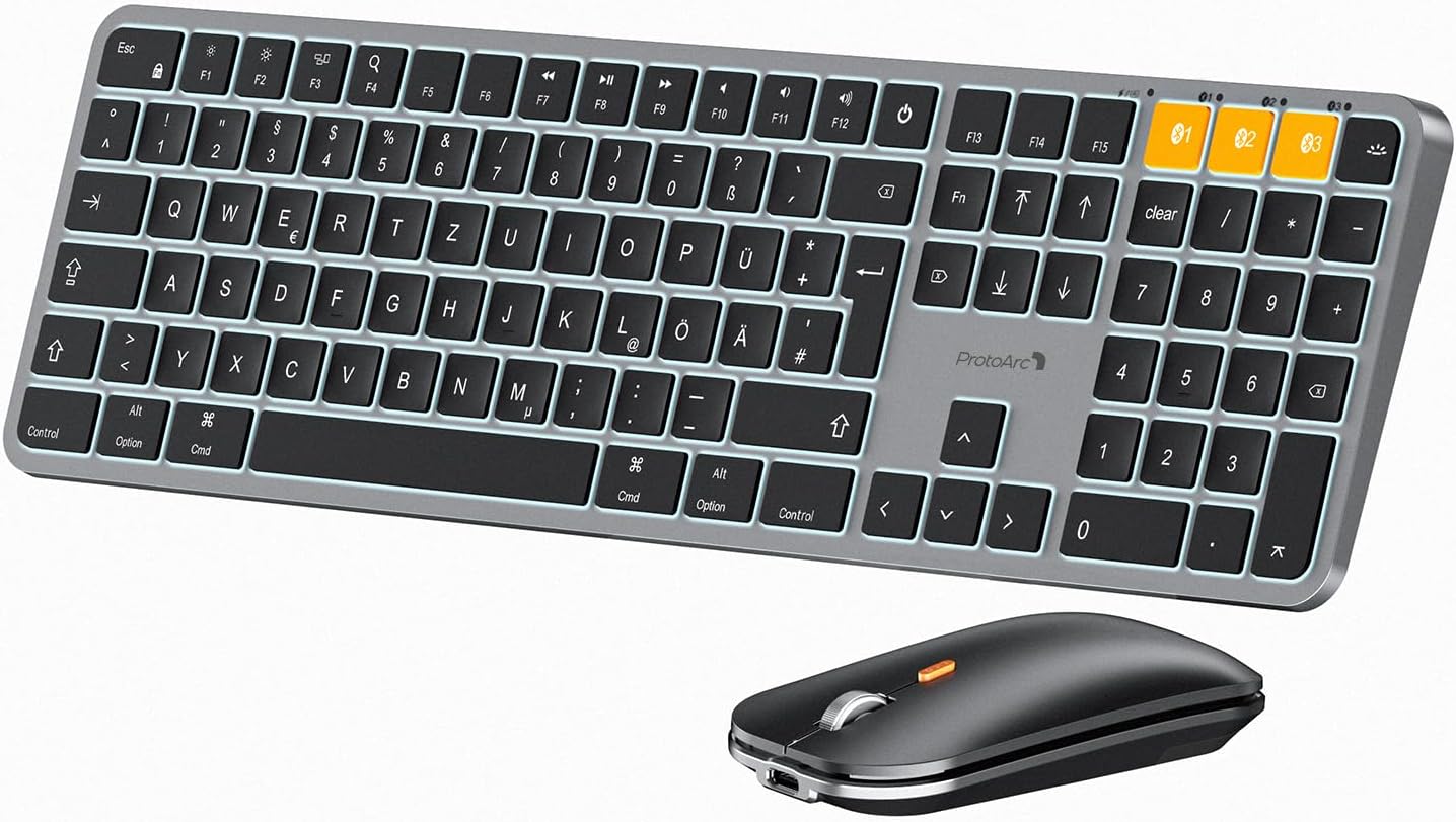 ProtoArc KM100-A Комплект осветена клавиатура и мишка безжична за Mac, Bluetooth QWERTZ безжична клавиатура с мишка, безжична плоска клавиатура за множество устройства за MacBook Pro, MacBook Air, iPhone, iPad, бяла