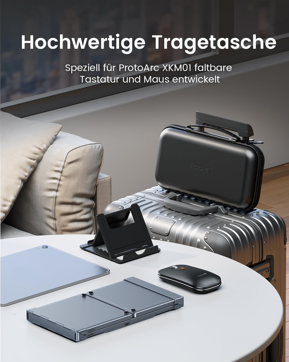 • Сгъваема клавиатура в пълен размер: Сгъваемата клавиатура ProtoArc в пълен размер със 105-клавишна цифрова клавиатура предлага 12 удобни клавиша за бърз достъп за лесно въвеждане на данни и навигация. Немската QWERTZ подредба осигурява безпроблемна съвместимост с компютри с Windows и Mac OS, така че можете бързо да свикнете с тази преносима клавиатура и мишка и да започнете да работите навсякъде.