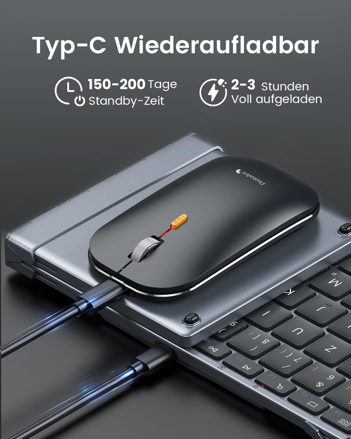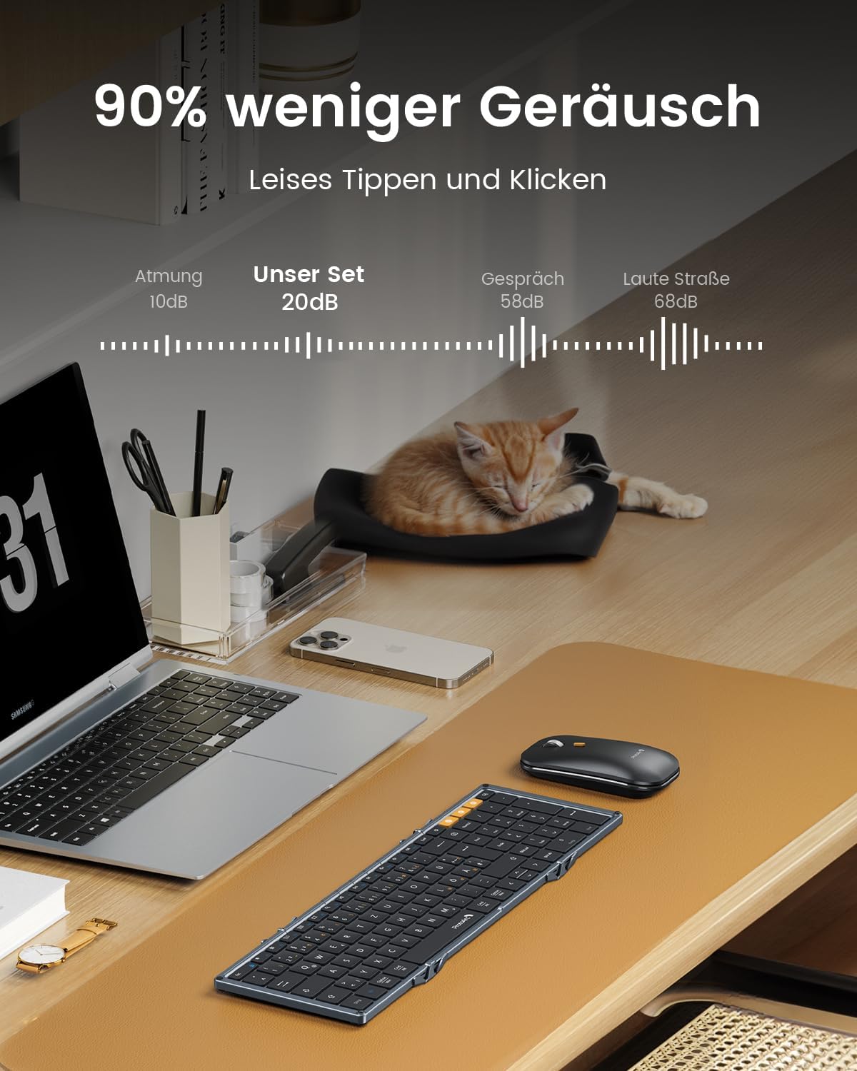 • Тиха безжична мишка и клавиатура: Сгъваемата Bluetooth клавиатура ProtoArc е с тихи ножични превключватели и нископрофилни клавиши. Тихата Bluetooth мишка с 3 регулируеми нива на DPI (1000–1600–2400) отговаря на вашите индивидуални нужди и осигурява плавно и прецизно щракване.