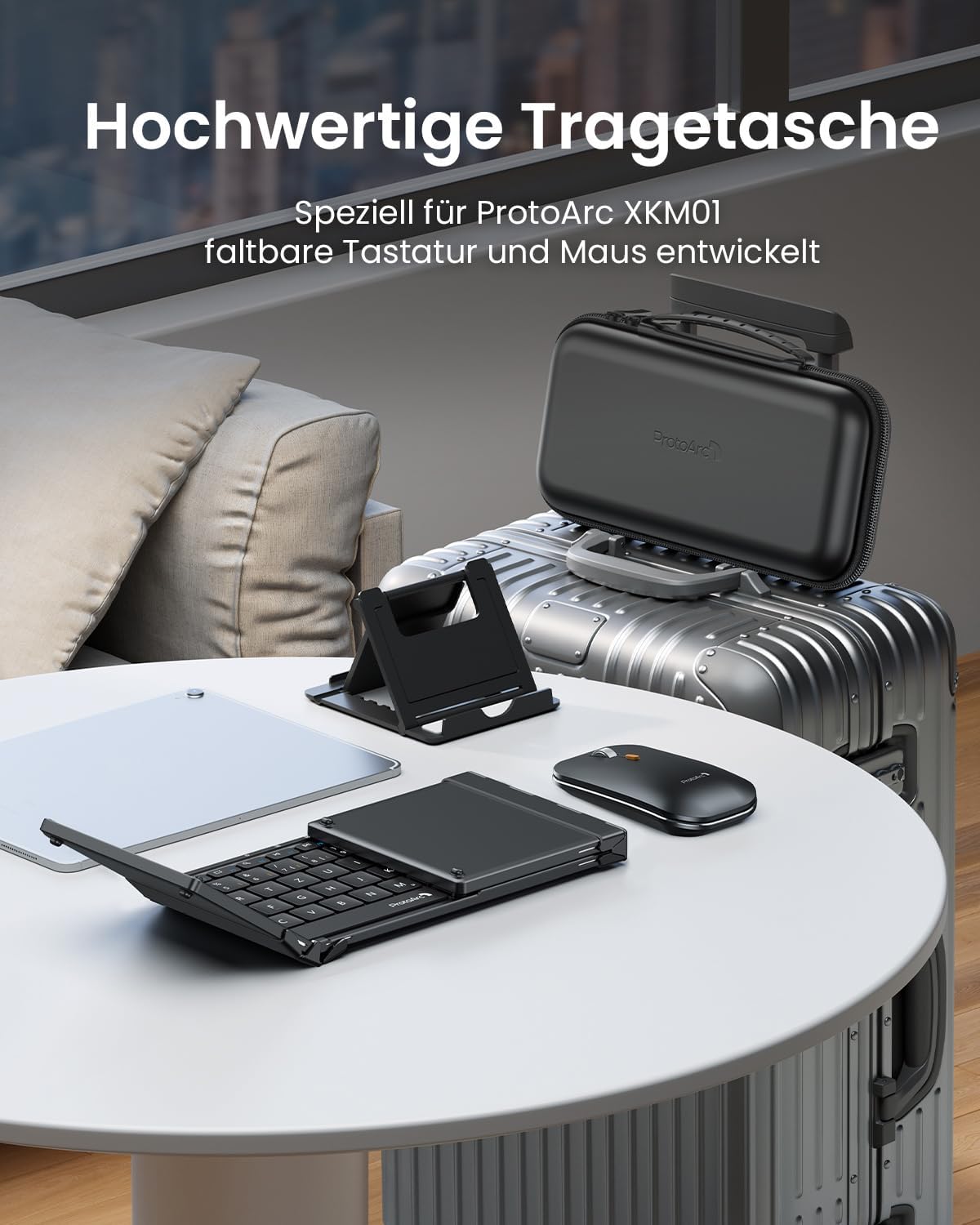 • Сгъваема клавиатура в пълен размер: Сгъваемата клавиатура ProtoArc в пълен размер със 105-клавишна цифрова клавиатура предлага 12 удобни клавиша за бърз достъп за лесно въвеждане на данни и навигация. Немската QWERTZ подредба осигурява безпроблемна съвместимост с компютри с Windows и Mac OS, така че можете бързо да свикнете с тази преносима клавиатура и мишка и да започнете да работите навсякъде.