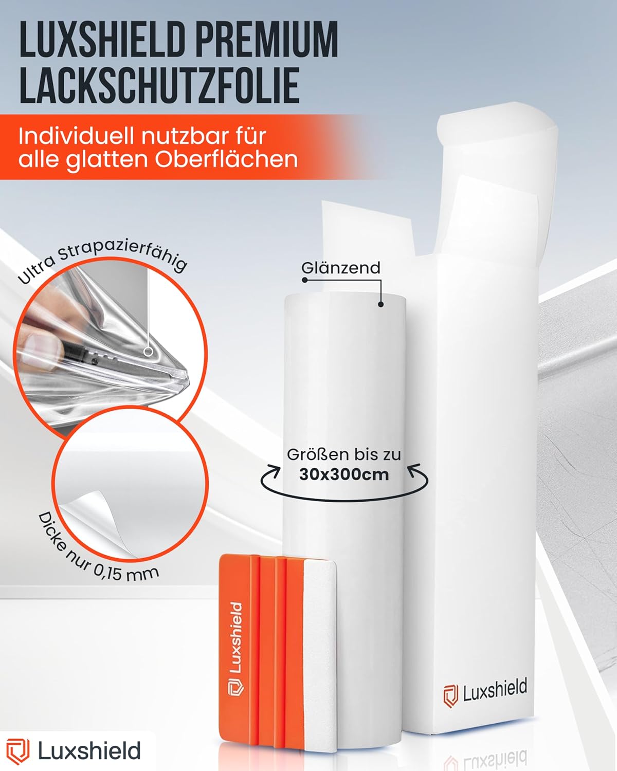 • Изключително здраво и лесно за отстраняване: нашето фолио с дебелина 0,15 мм е устойчиво на студ, топлина, влага, лед, сол, UV лъчение и много други. Автомивките също не са проблем за това здраво и защитно фолио. Защитното фолио за боя Luxshield обаче не оставя следи след отлепване, дори след години защита на боята.