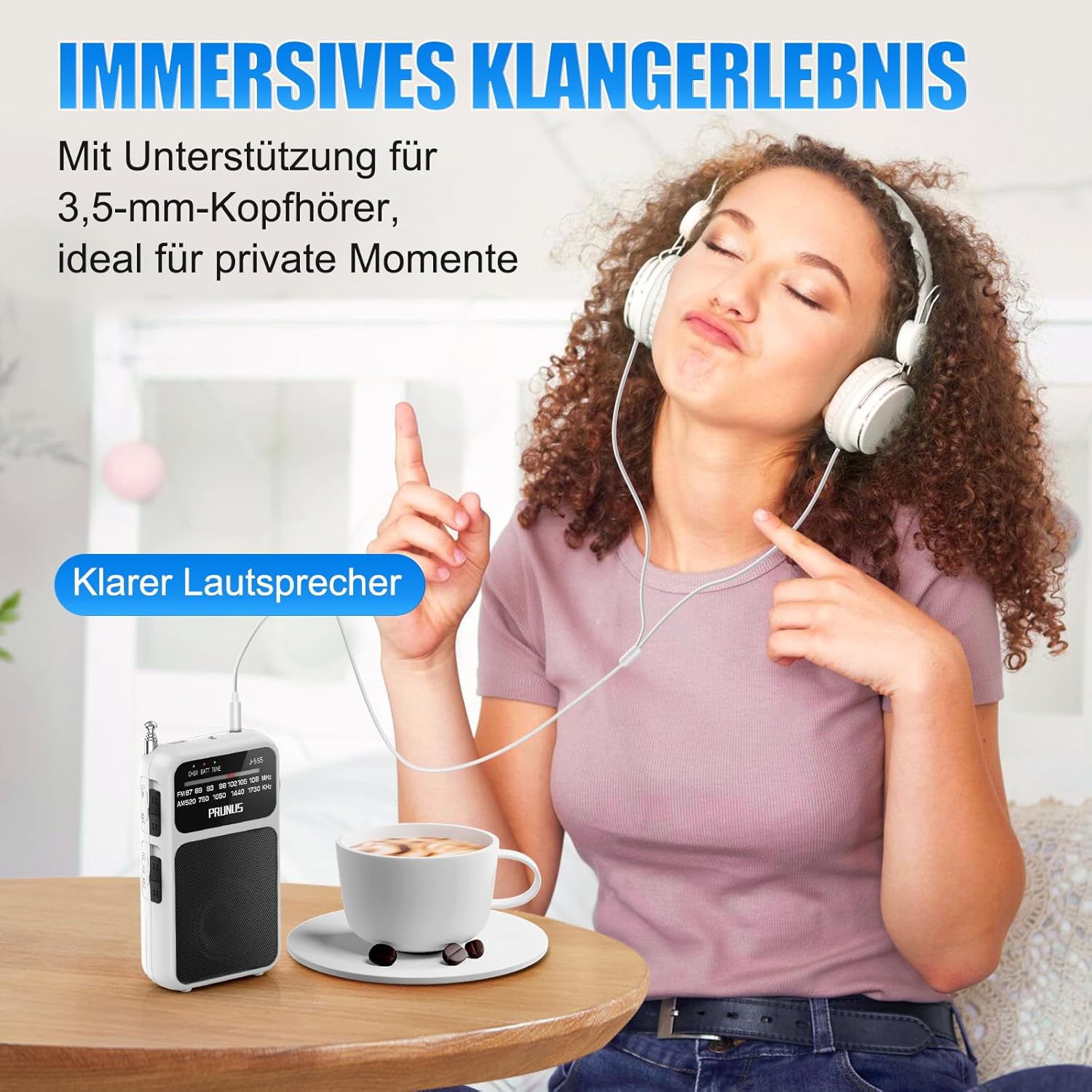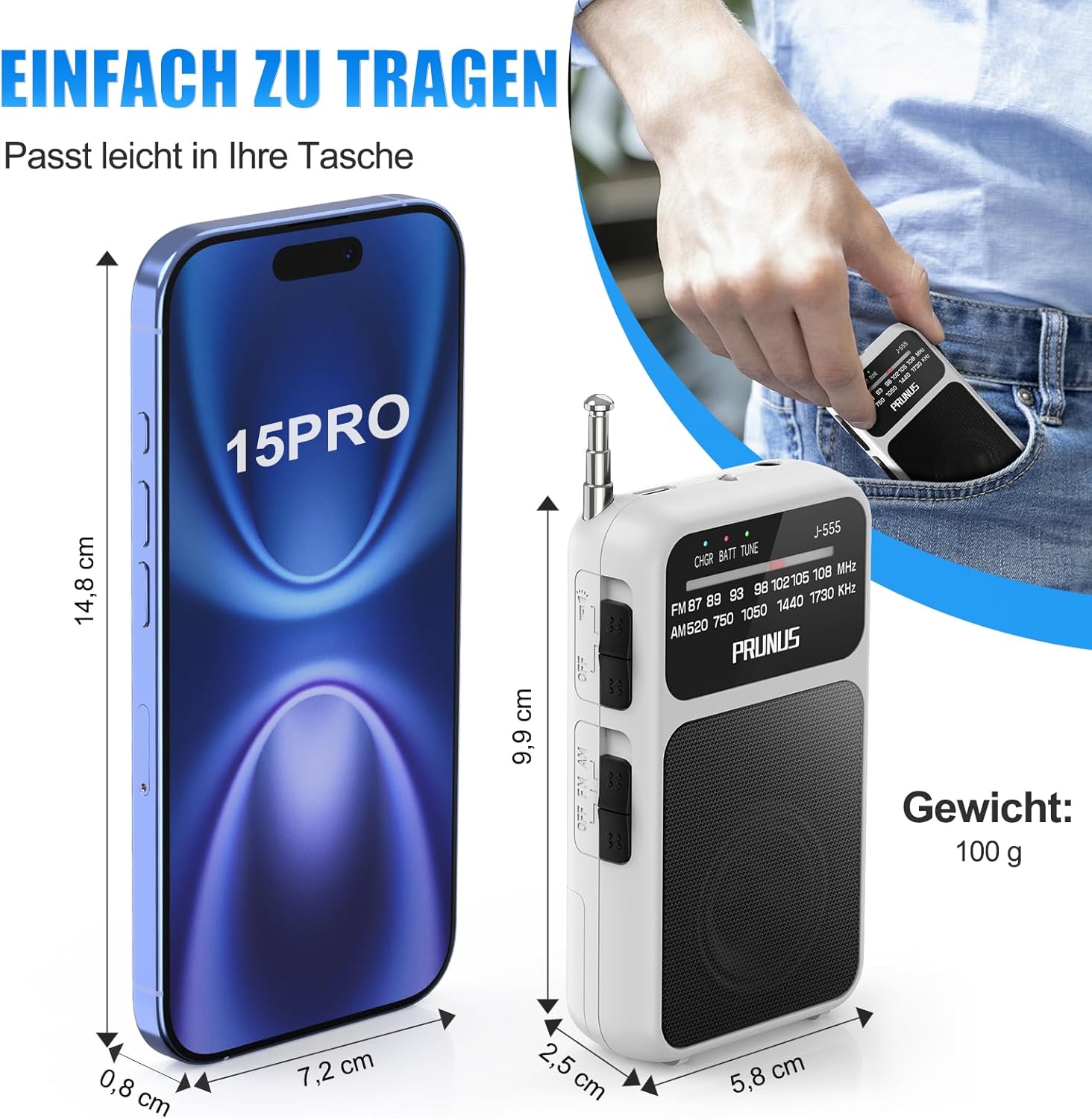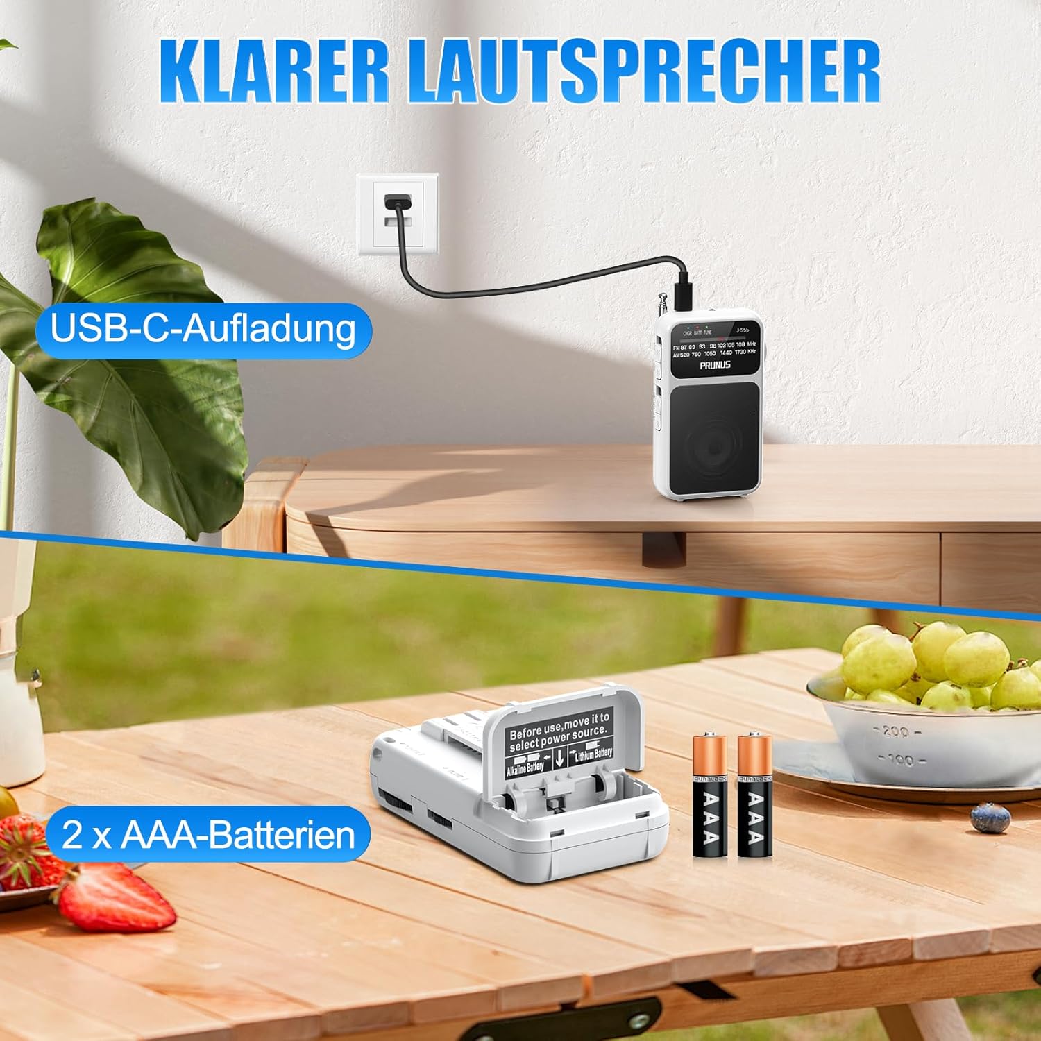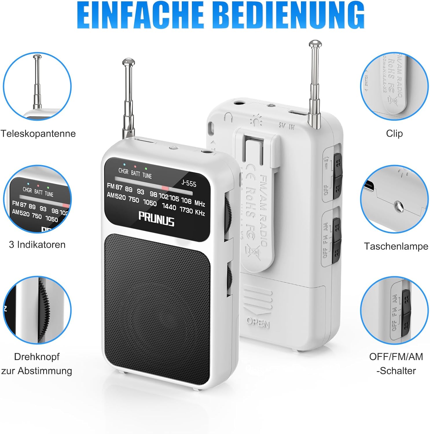 PRUNUS J-555 AM/FM/FM радио малко, малко радио с батерия, зареждане чрез USB-C, мини радио, работещо с батерии AAA, със задна щипка и връзка за джогинг, къмпинг, при прекъсване на захранването. (Бяло)