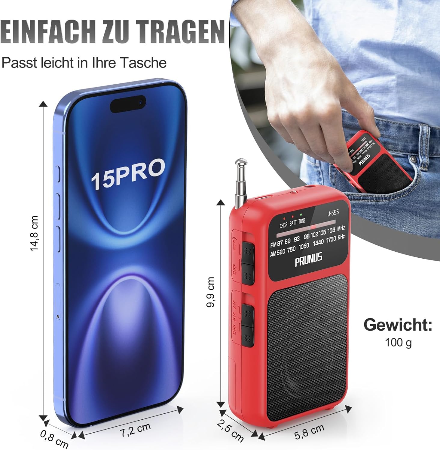 • Ултра мини дизайн: джобно радио, което се побира удобно в ръката ви. С размери 9,9 x 6,3 x 2,5 см, това леко мини радио тежи само 100 г. Оборудвано с каишка за носене и щипка, можете лесно да го прикрепите към колана си или да го окачите на чантата си, за да слушате любимите си станции по всяко време и навсякъде на открито.