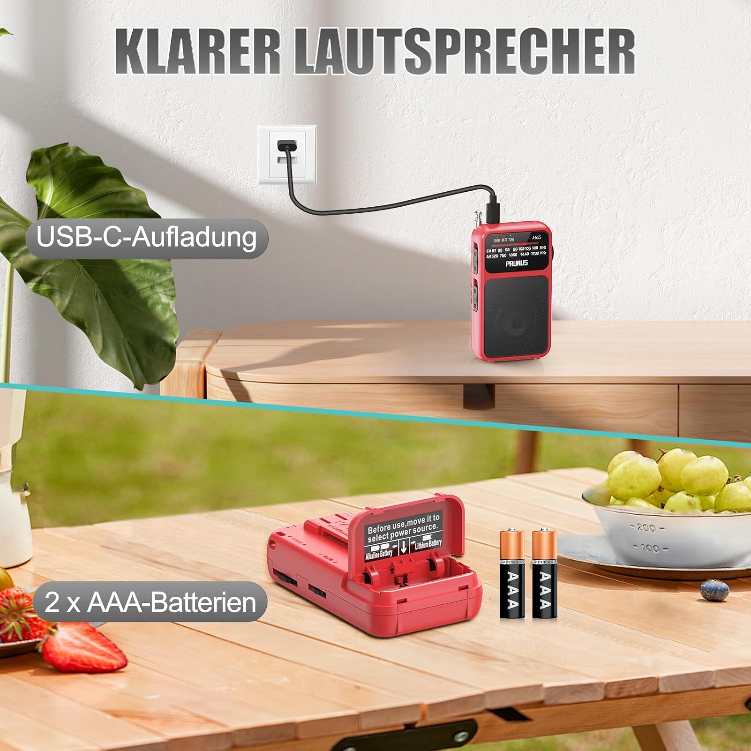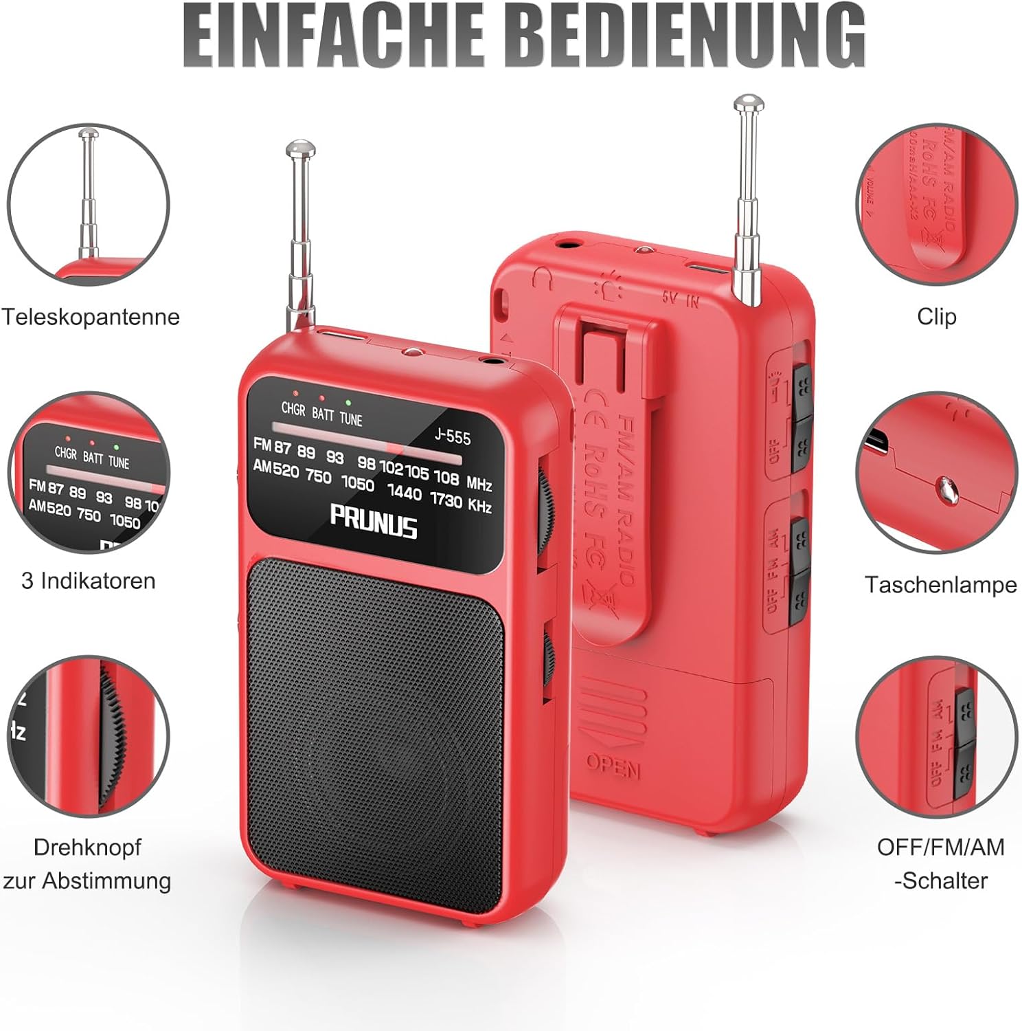 PRUNUS J-555 AM/FM/FM радио малко, малко радио с батерия, зареждане чрез USB-C, мини радио, работещо с батерии AAA, със задна щипка и връзка за джогинг, къмпинг, при прекъсване на захранването. (Червено)