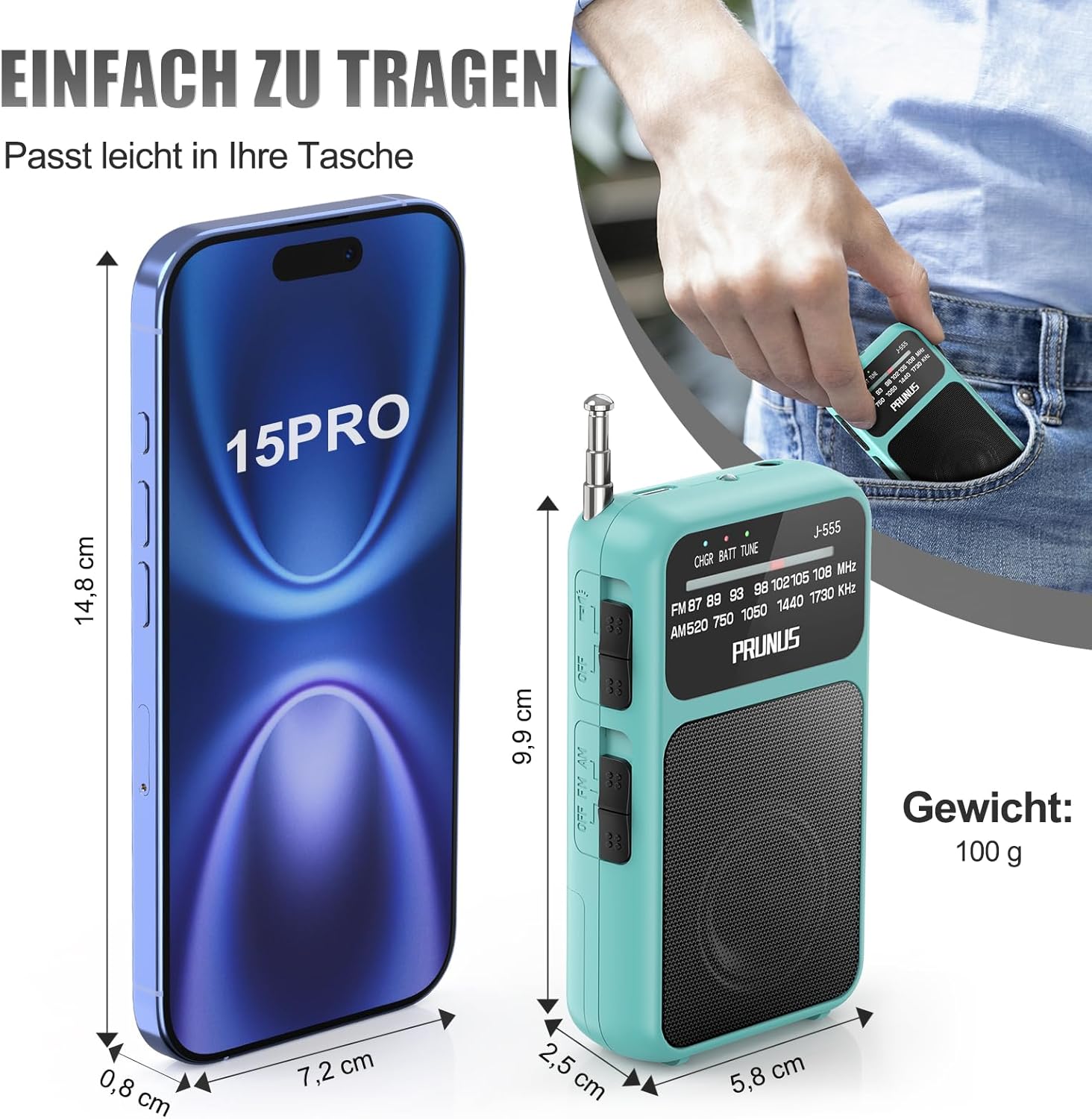 • Ултра мини дизайн: джобно радио, което се побира удобно в ръката ви. С размери 9,9 x 6,3 x 2,5 см, това леко мини радио тежи само 100 г. Оборудвано с каишка за носене и щипка, можете лесно да го прикрепите към колана си или да го окачите на чантата си, за да слушате любимите си станции по всяко време и навсякъде на открито.
