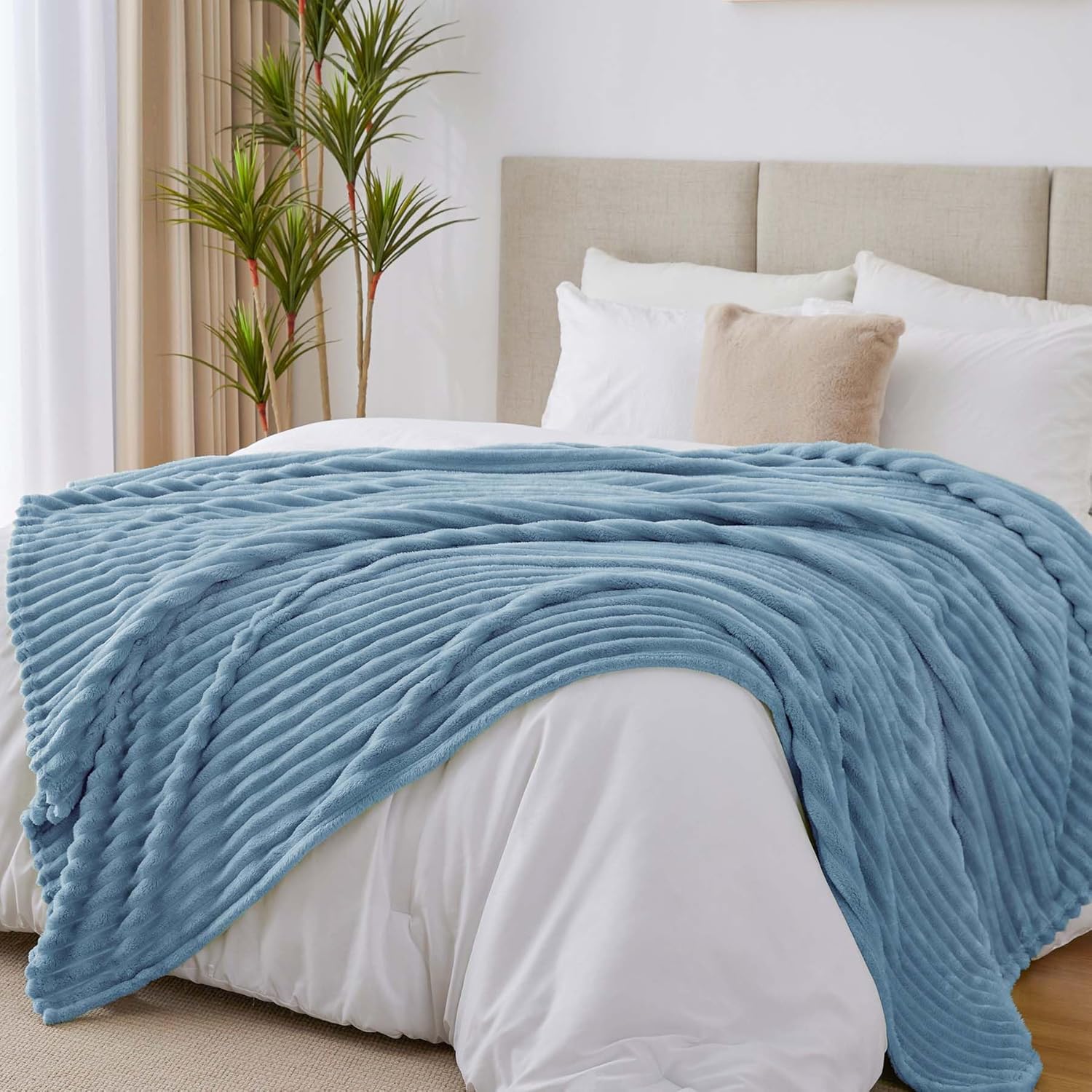 Пухкаво одеяло BEDELITE Cuddly Fluffy Blanket Large - Меки фланелени одеяла сини 220 x 240 см за легло, Декоративни райета от полар светло синьо като покривало за спалня, XXL одеяло за широка употреба