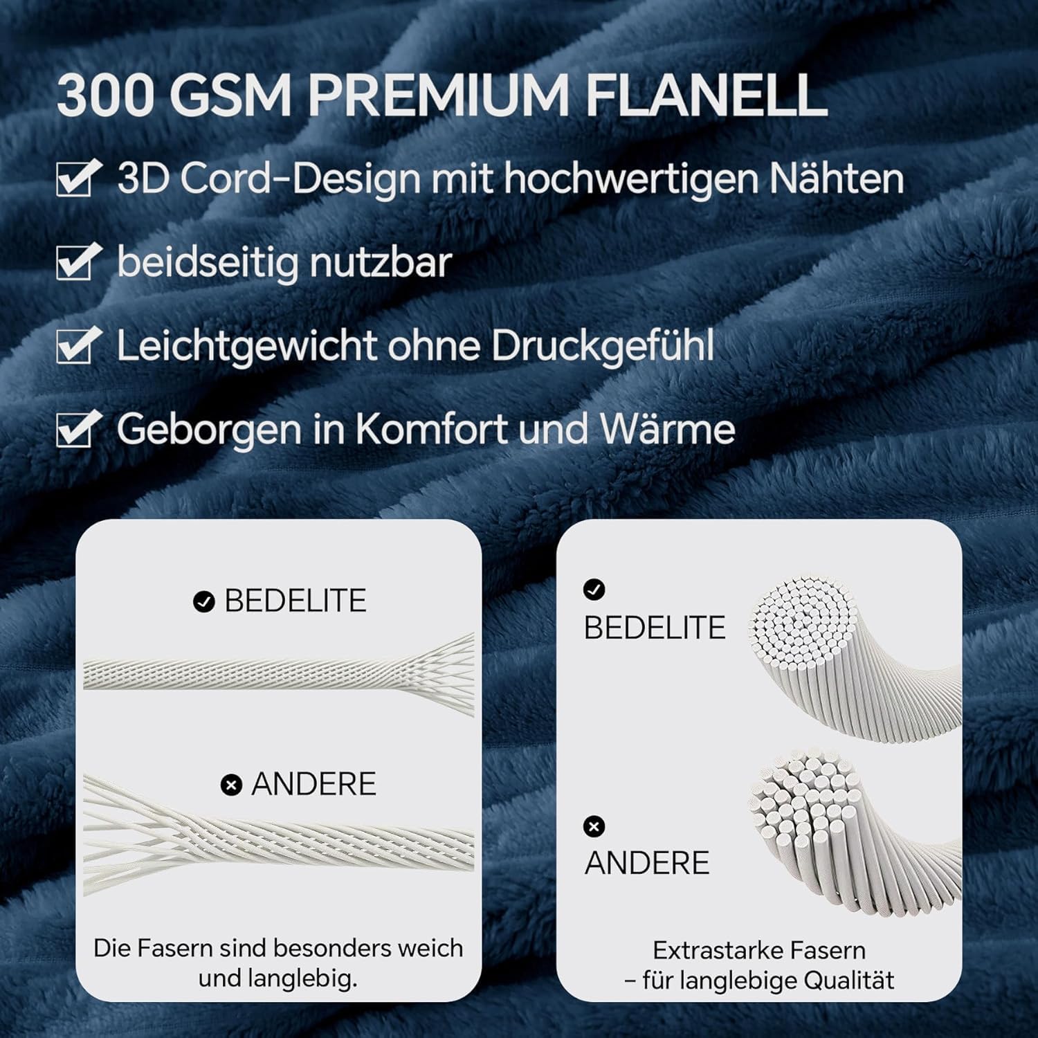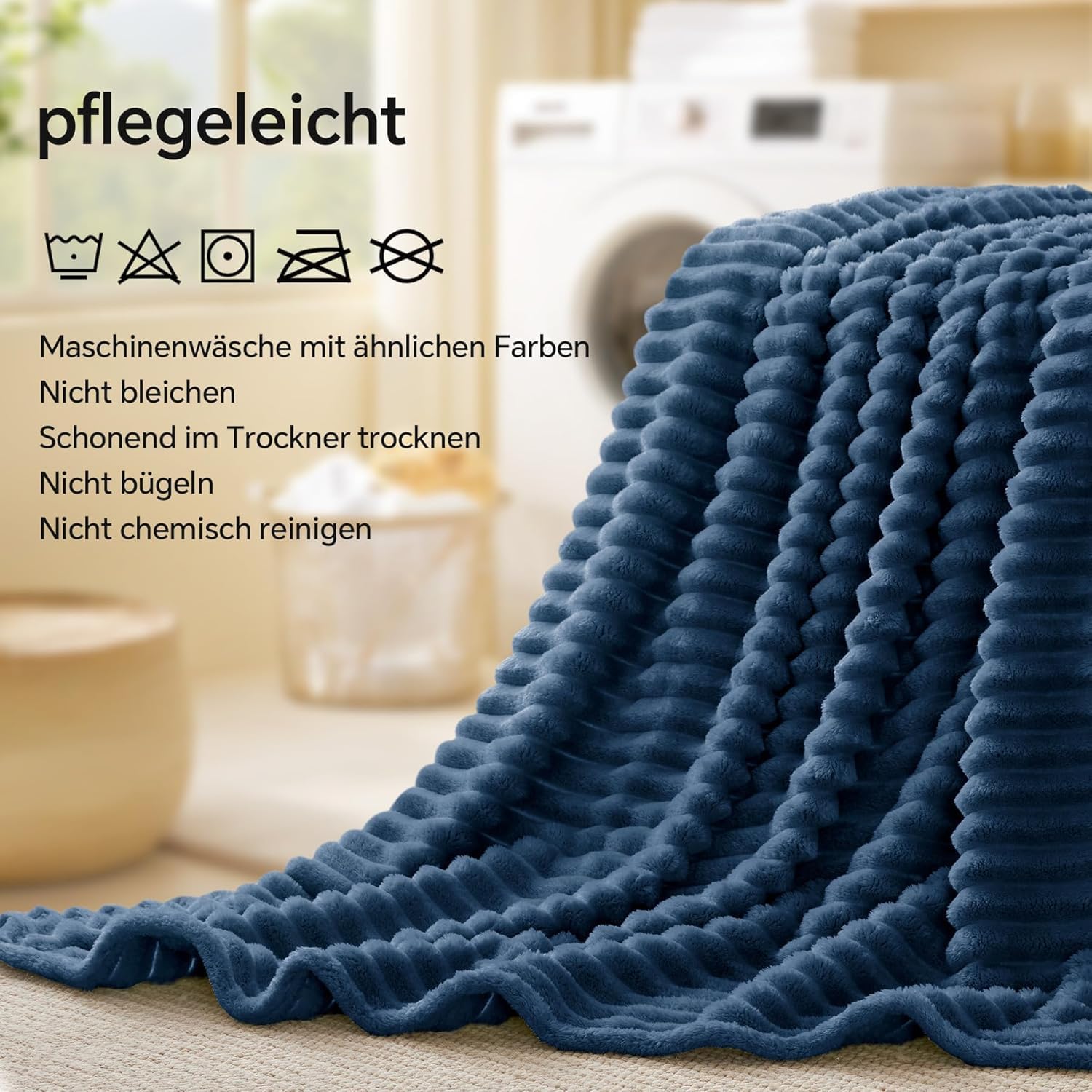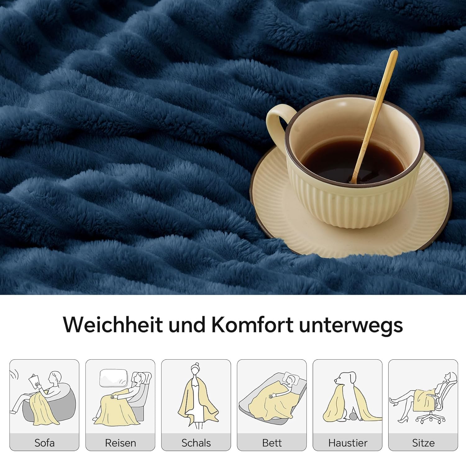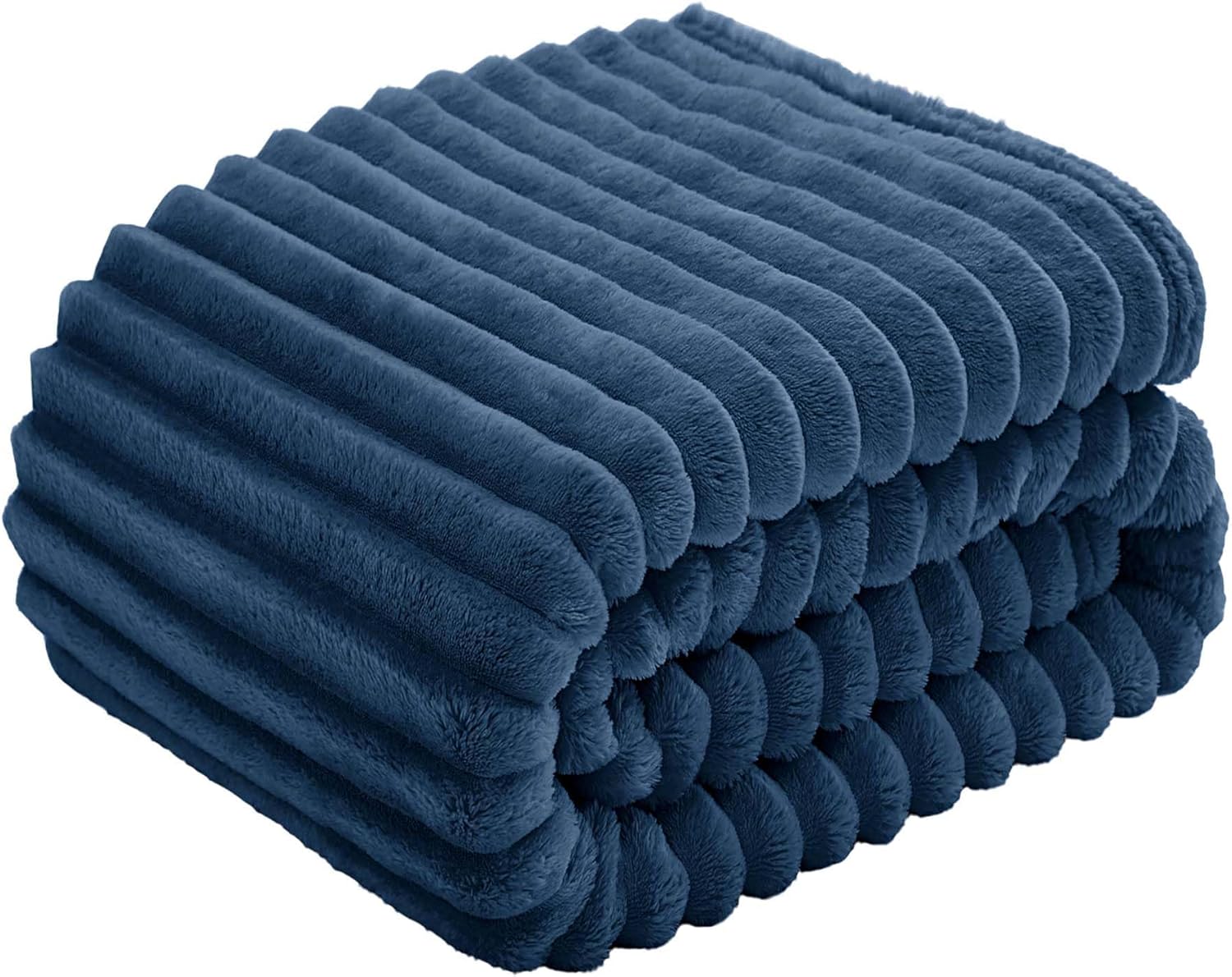 Пухкаво одеяло BEDELITE Cuddly Fluffy Blanket Large - Меки фланелени одеяла сини 220 x 240 см за легло, Декоративни райета от полар, тъмносиньо като покривало за спалня, XXL одеяло за широка употреба