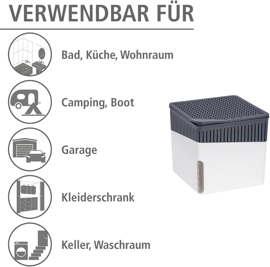 Дизайнерският куб за обезвлажнител от Wenko осигурява по-малко влага и по-приятен климат. Модерният обезвлажнител се интегрира елегантно във всяка стая и създава визуален акцент с модерна кубична форма.