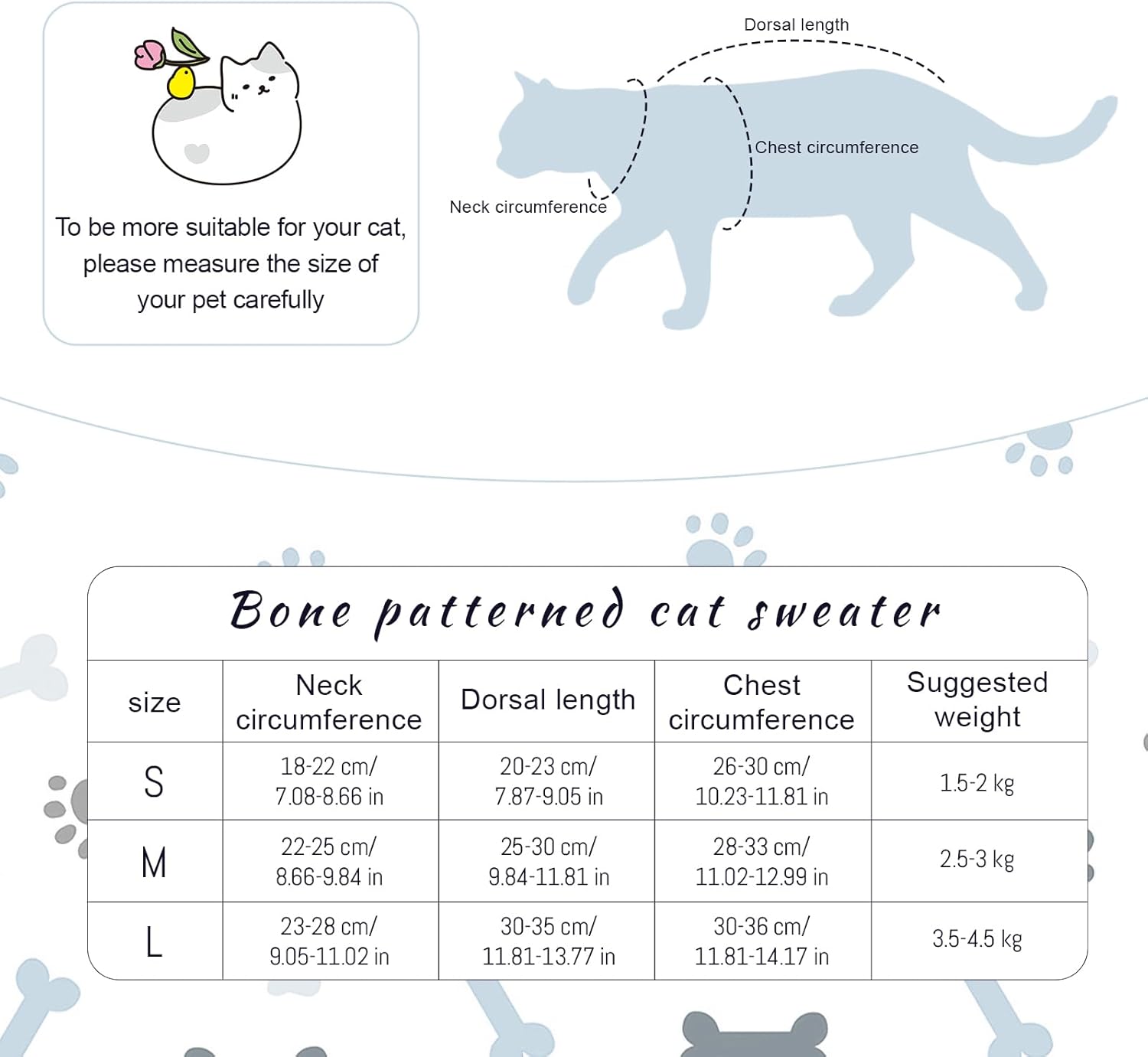 2. Поради ръчно измерване, пуловерът може да има грешка от 1-3 см. Ако измереният размер на вашия домашен любимец е между два размера, препоръчително е да изберете по-голям размер.
