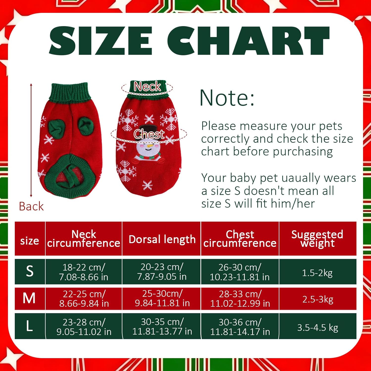 2. Поради ръчно измерване, пуловерът може да има грешка от 1-3 см. Ако измереният размер на вашия домашен любимец е между два размера, препоръчително е да изберете по-голям размер.