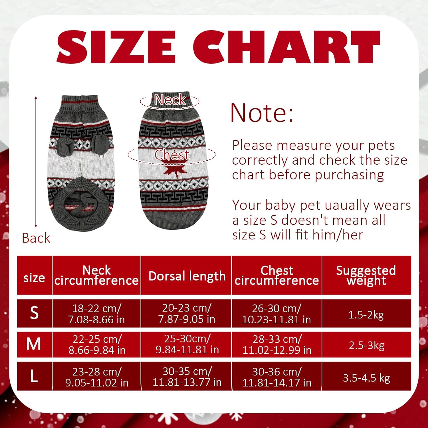 2. Поради ръчно измерване, пуловерът може да има грешка от 1-3 см. Ако измереният размер на вашия домашен любимец е между два размера, препоръчително е да изберете по-голям размер.