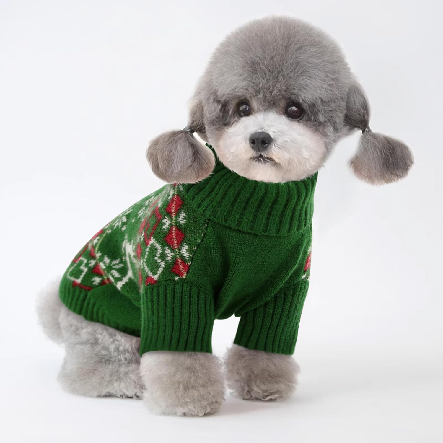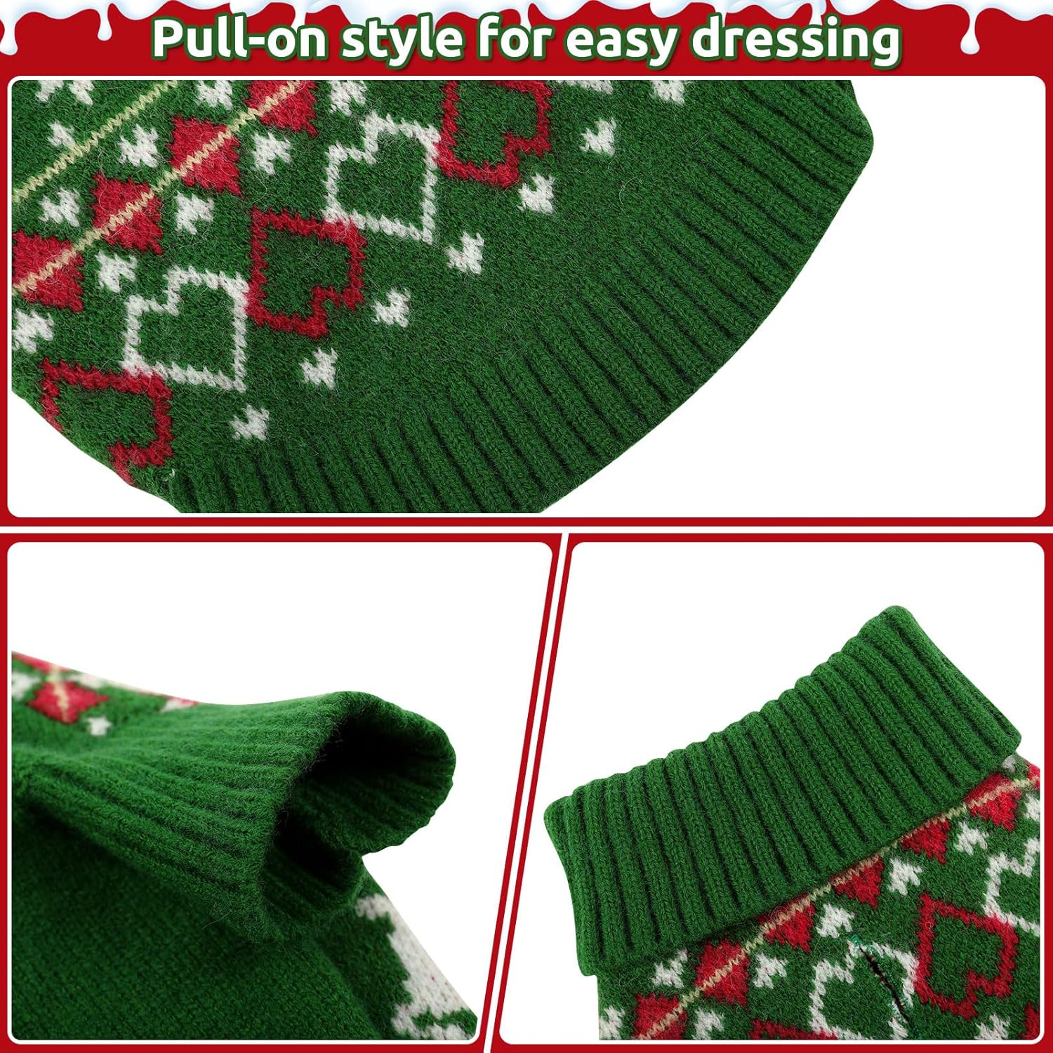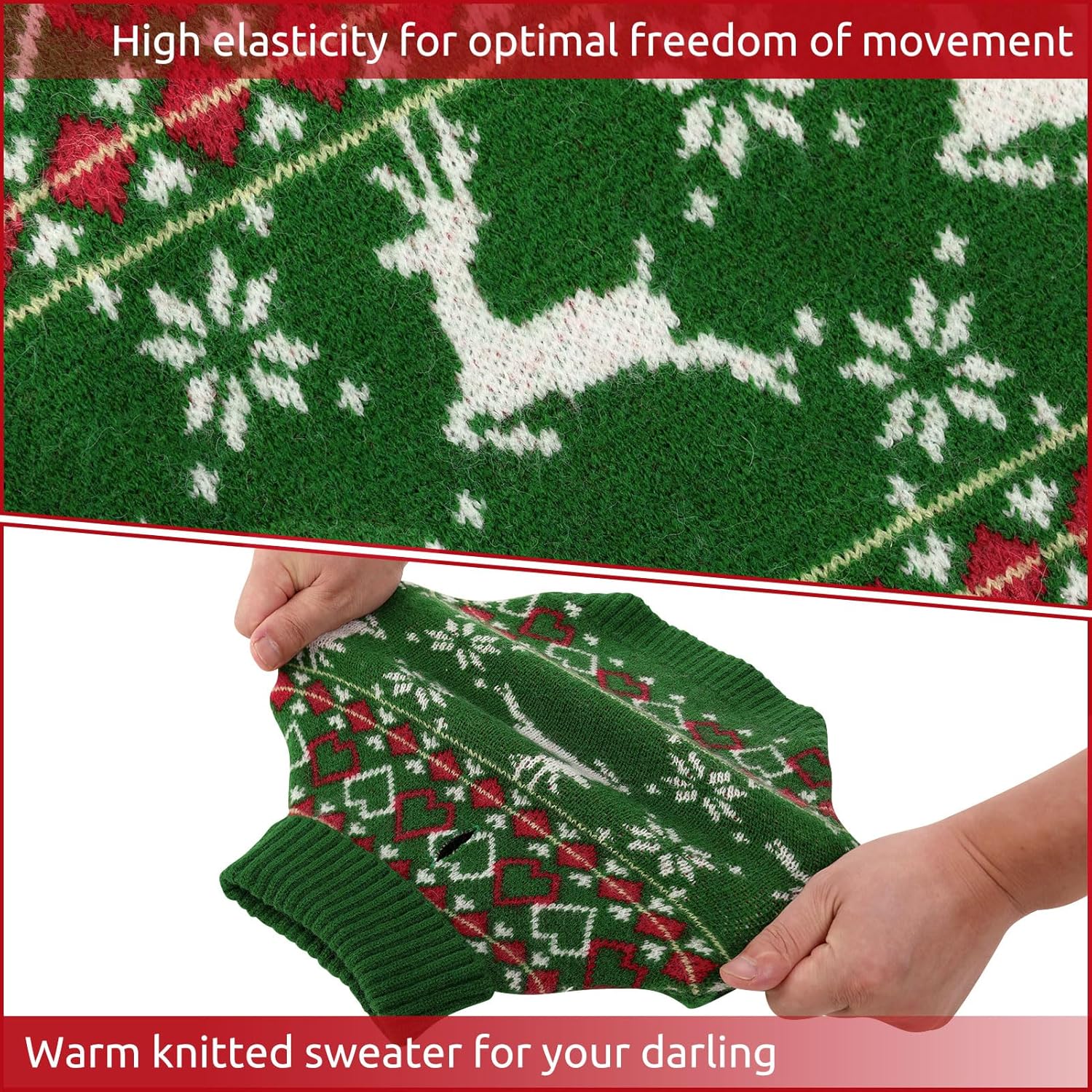 • Топлина и комфорт: изработен от висококачествени материали, пуловерът за кучета не само предлага празнична визия, но и държи кучето ви топло и уютно в студа