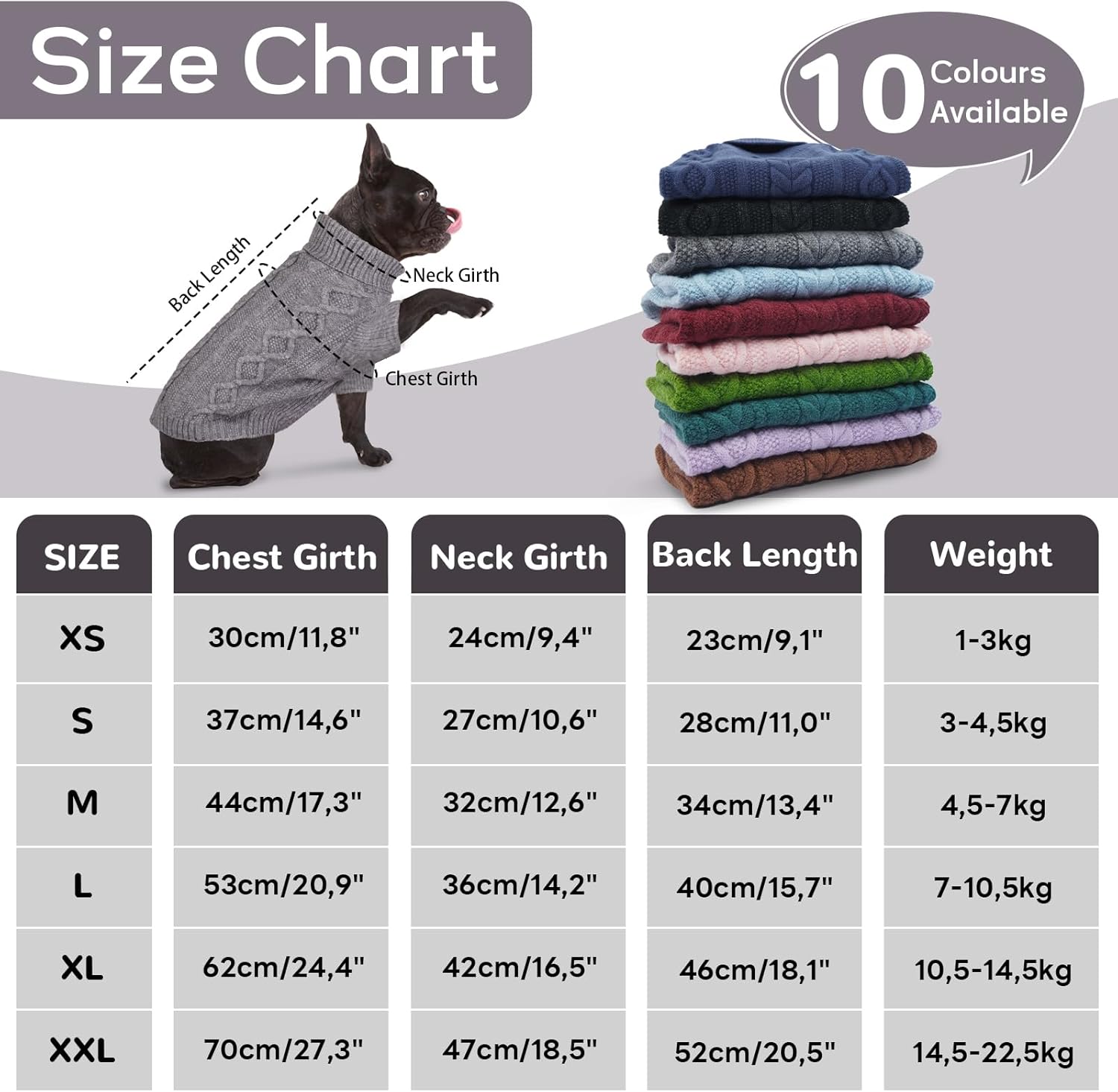 XS: Гръб 23 см/9,1 инча, гръден кош 30 см/11,8 инча, шия 23 см/9,1 инча, тегло 2-6 фунта.