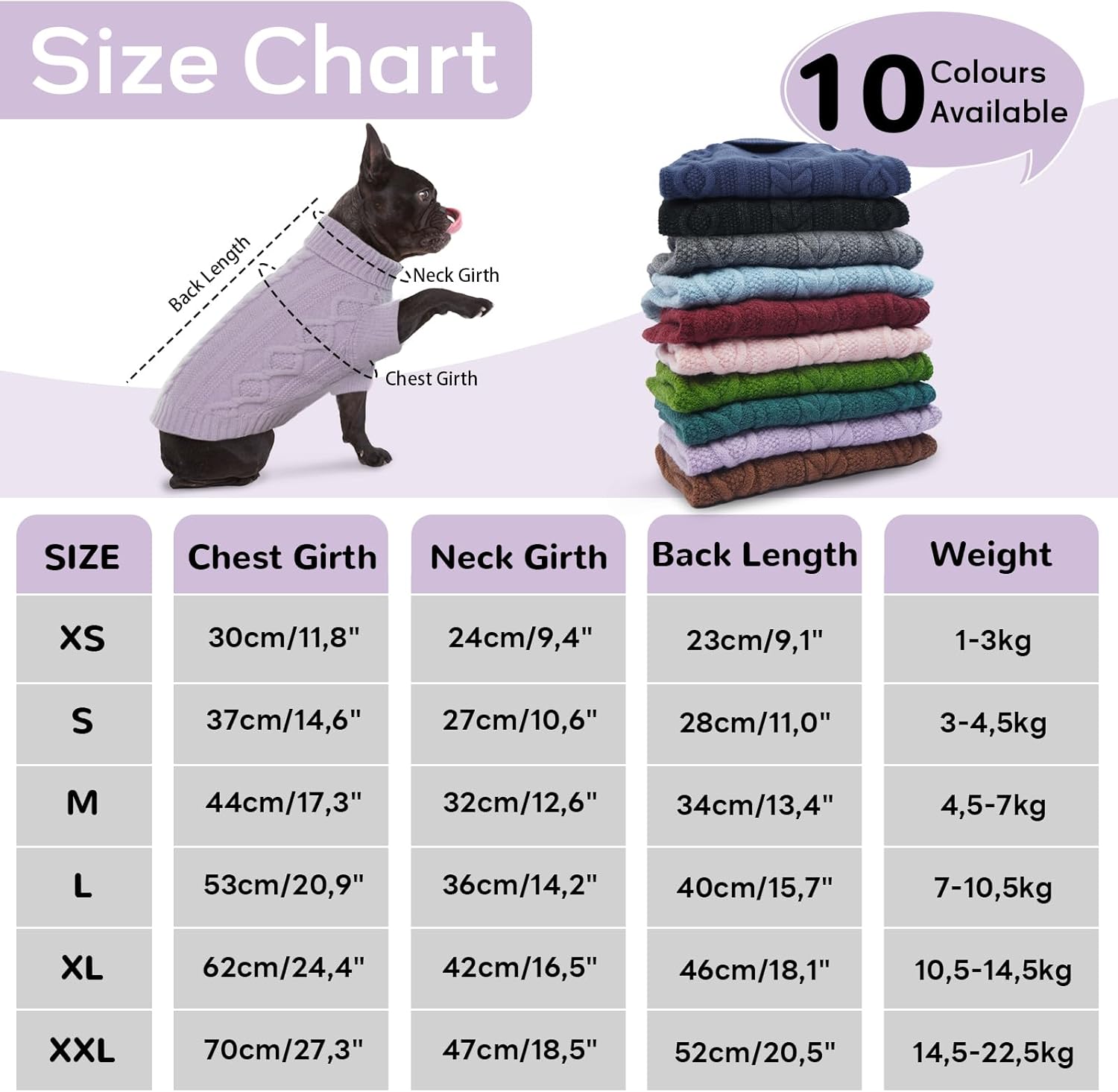 XS: Гръб 23 см/9,1 инча, гръден кош 30 см/11,8 инча, шия 23 см/9,1 инча, тегло 2-6 фунта.
