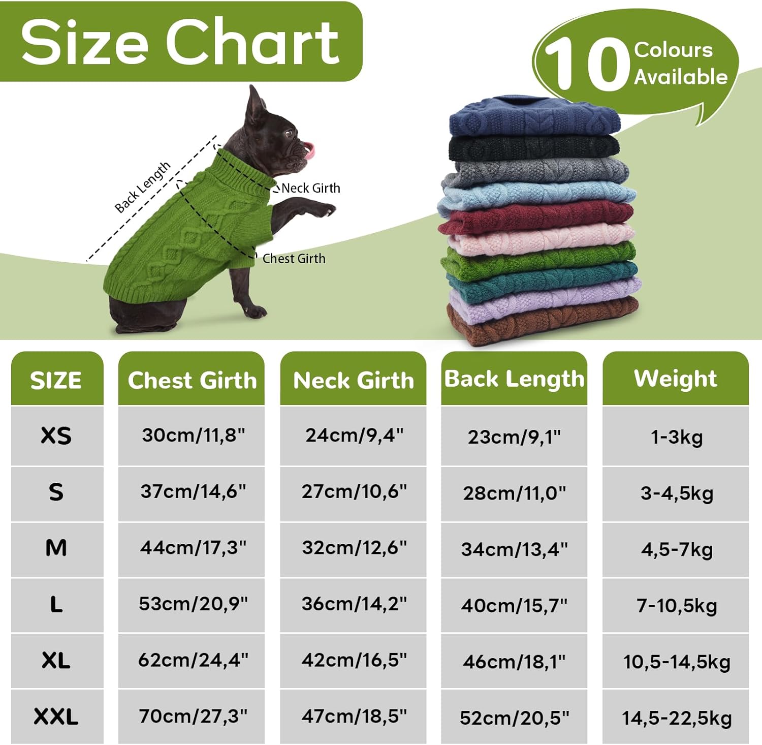 XS: Гръб 23 см/9,1 инча, гръден кош 30 см/11,8 инча, шия 23 см/9,1 инча, тегло 2-6 фунта.